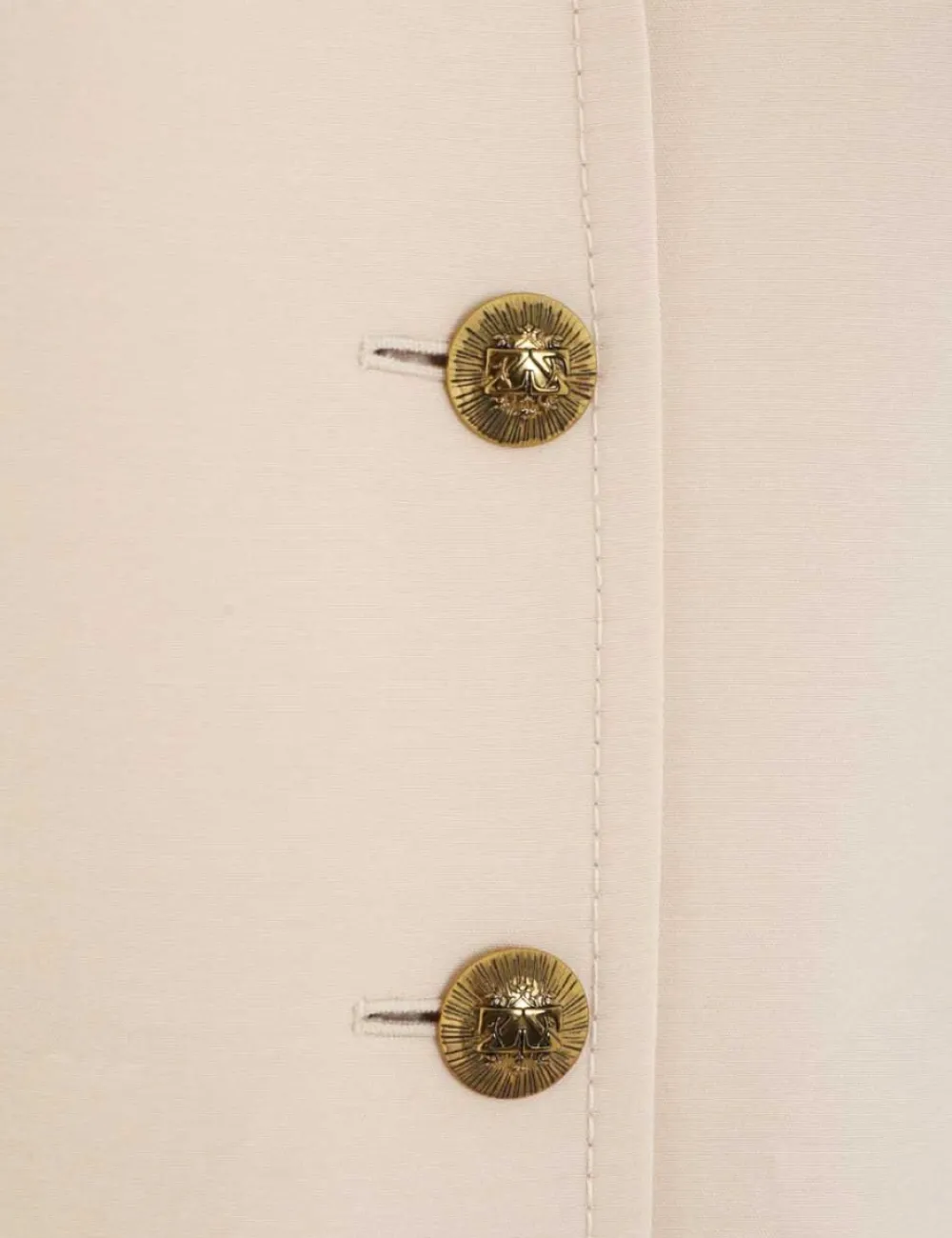 The Lyrical Patch Pocket Coat In Macadamia From Our Fall 2023 Collection, Luminosity. A Wool Blend Coat Featuring Large Patch Pockets And Custom Branded Gold Buttons.