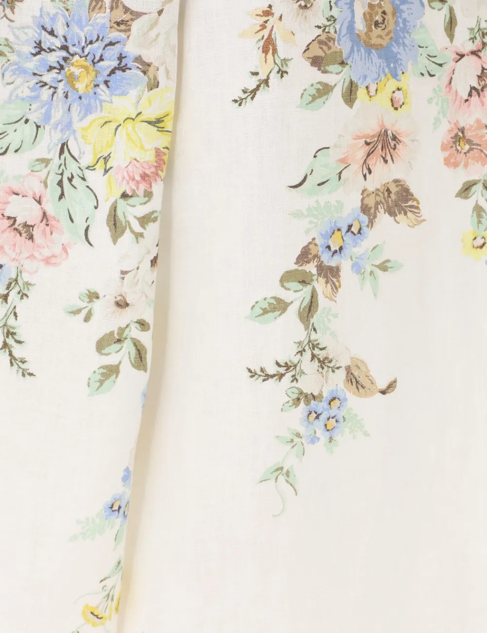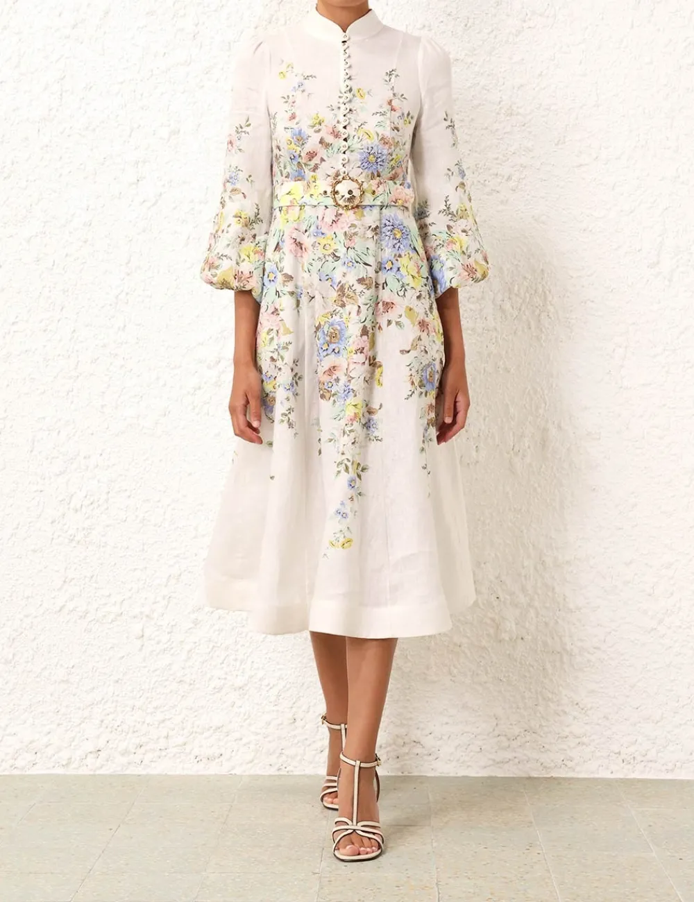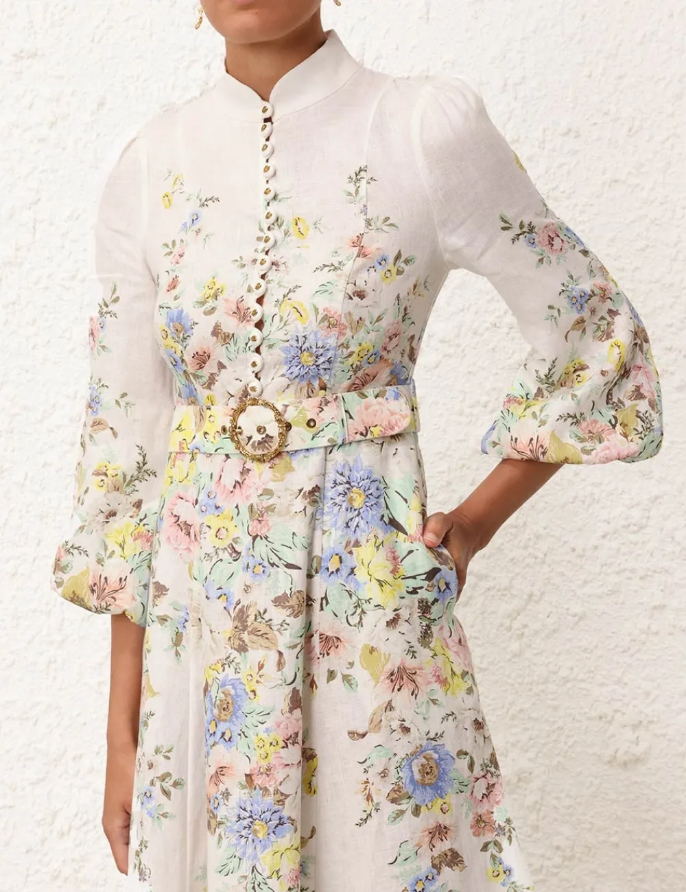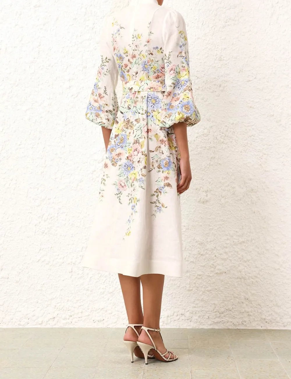 The Matchmaker Buttoned Midi Dress In Cream/Blue Floral From Our Resort 2024 Collection, Matchmaker. A Linen Midi Dress Featuring A Stand Collar And Exaggerated Sleeves.