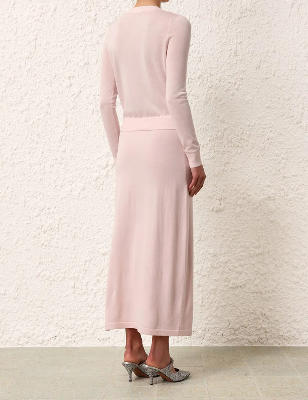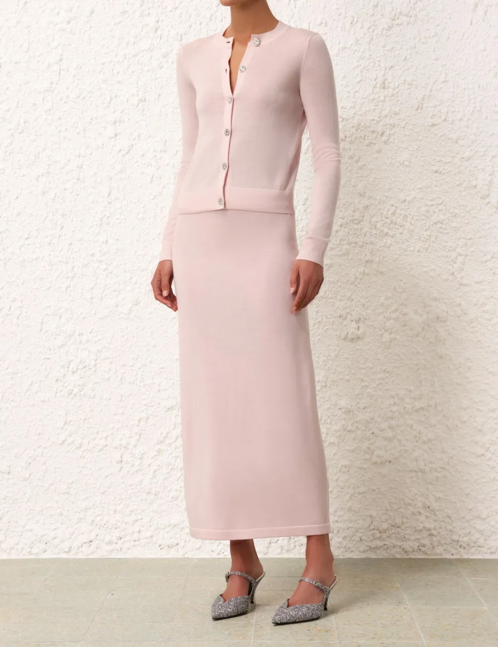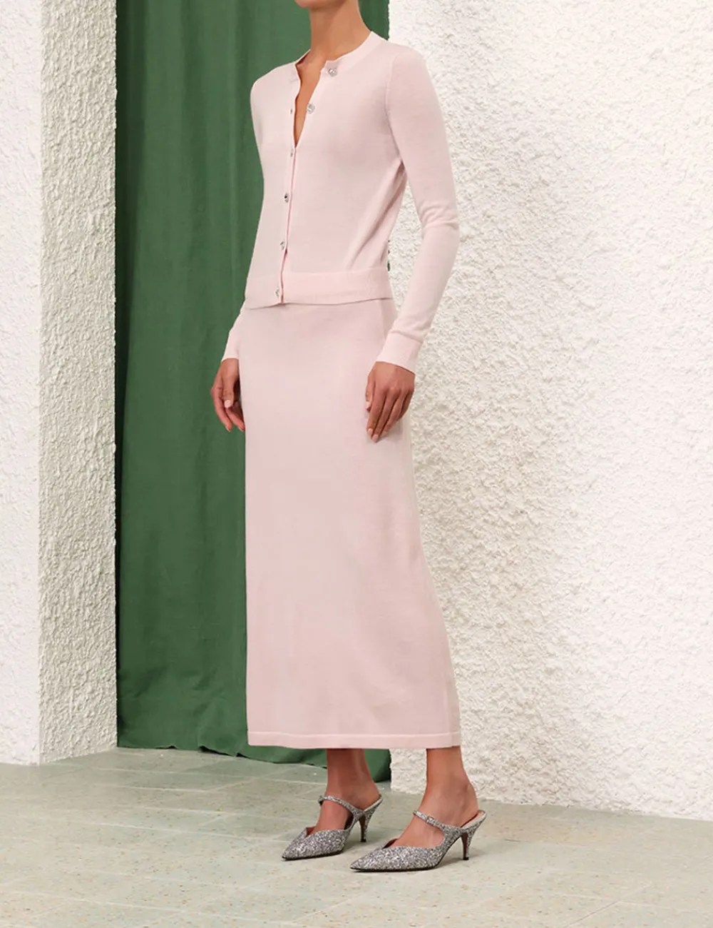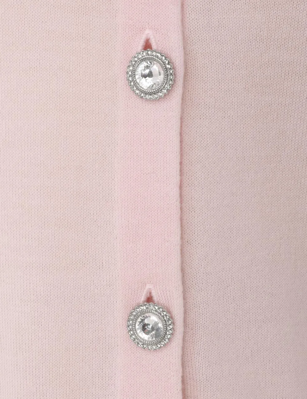 The Matchmaker Embellished Cardigan In Dusty Pink From Our Resort 2024 Collection, Matchmaker. A Wool Cardigan Featuring Crystal Buttons Down The Centre Front.