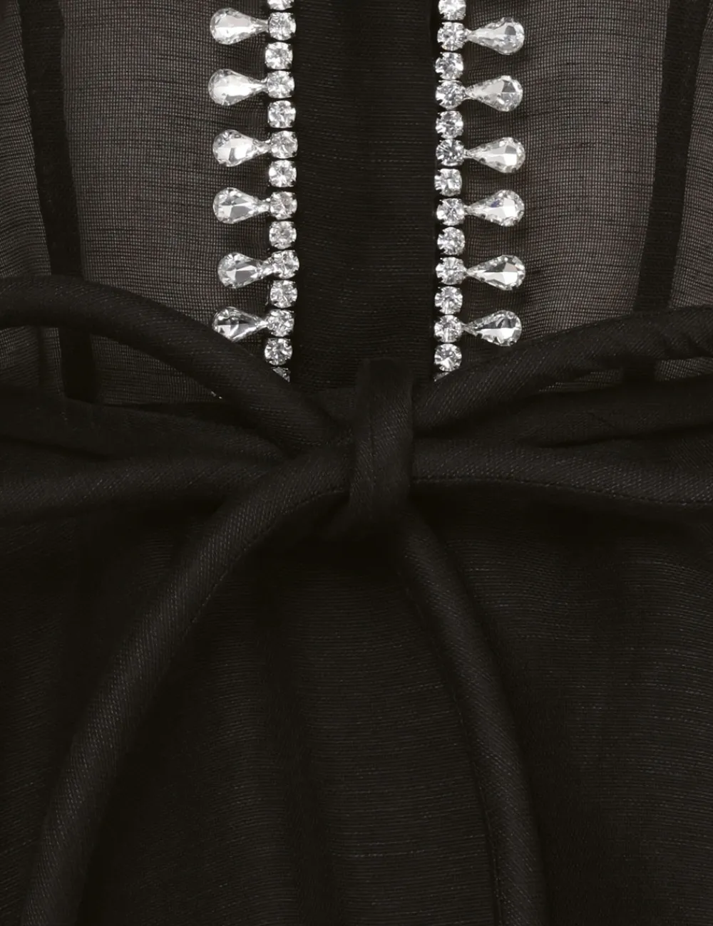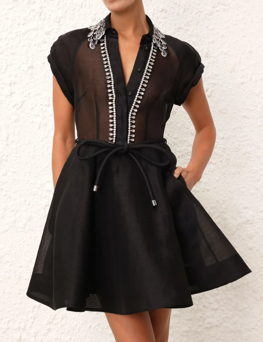 The Matchmaker Flip Dress In Black From Our Resort 2024 Collection, Matchmaker. A Silk Linen Organza Mini Dress Featuring A Shirt Shaped Bodice And Full Mini Skirt, Finished With Crystal Trims Throughout.