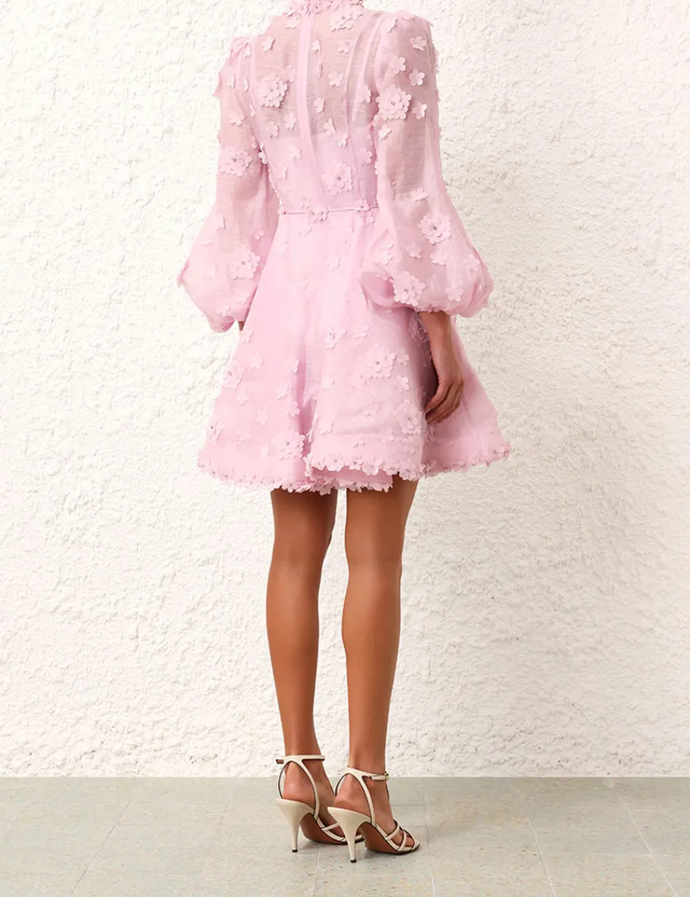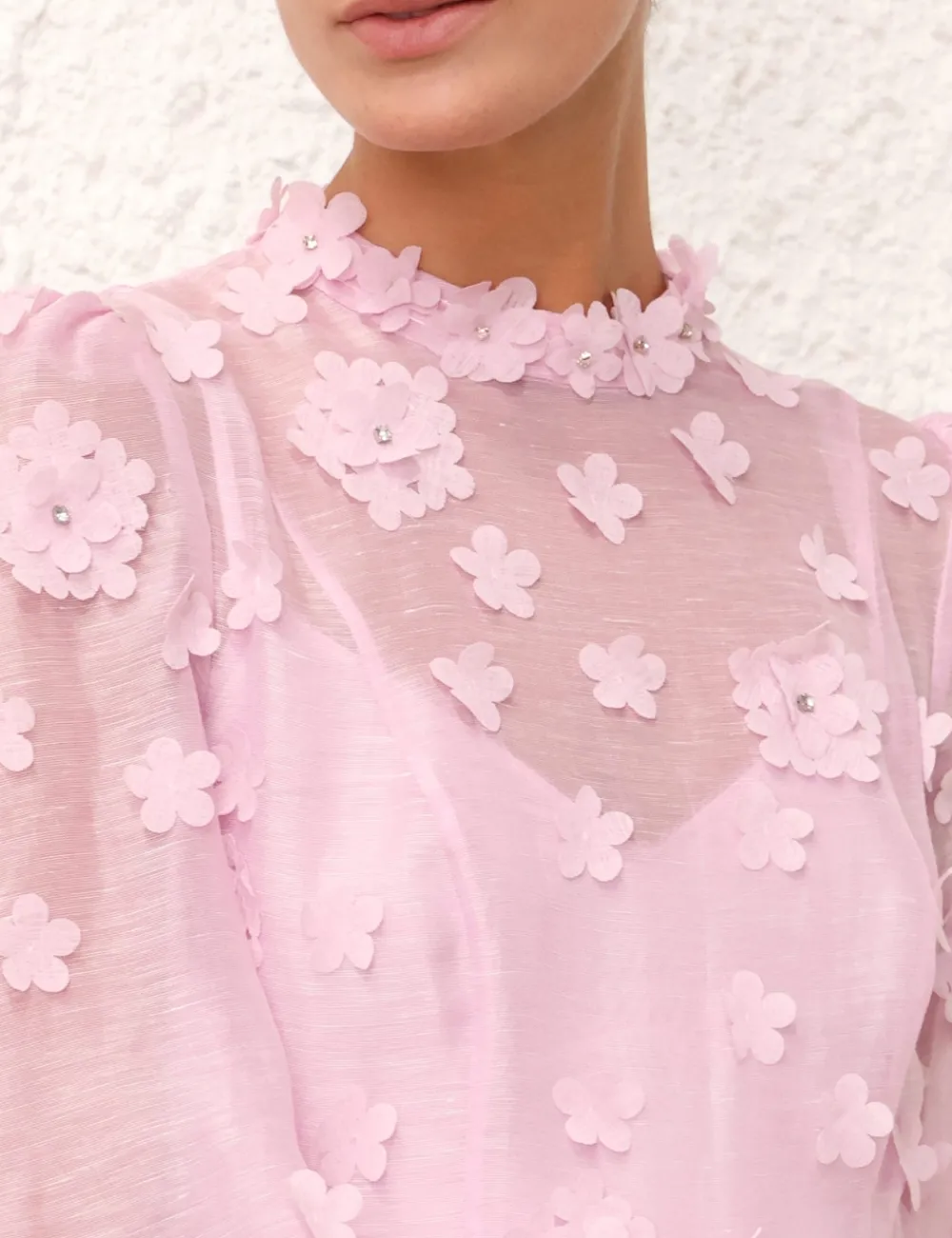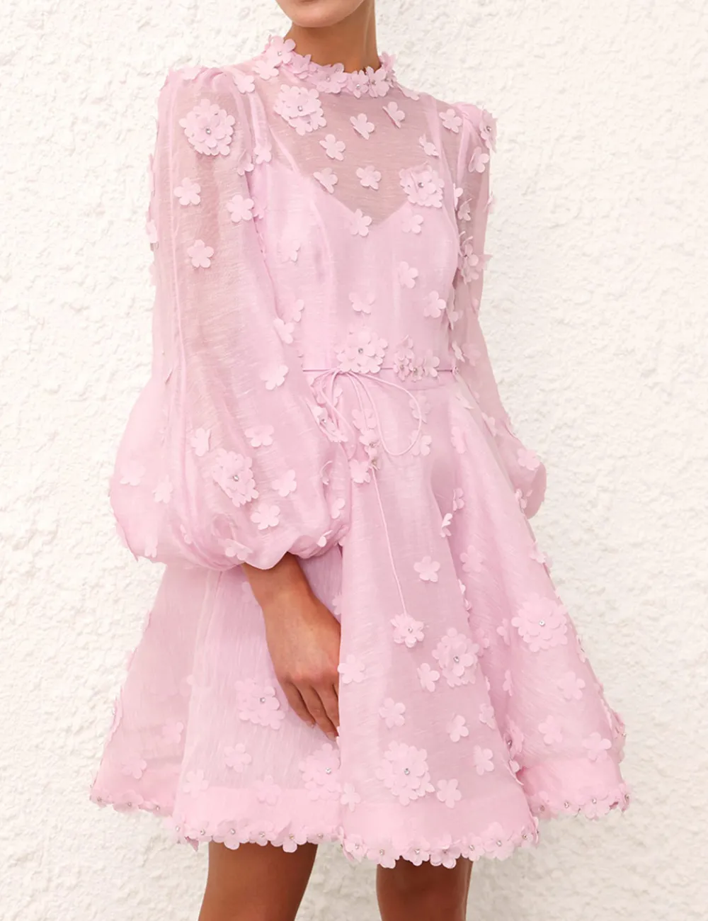 The Matchmaker Lift Off Mini In Lilac From Our Resort 2024 Collection, Matchmaker. A Silk Linen Organza Mini Dress Featuring A Flower Trim And A Pleated Sleeve Hem.