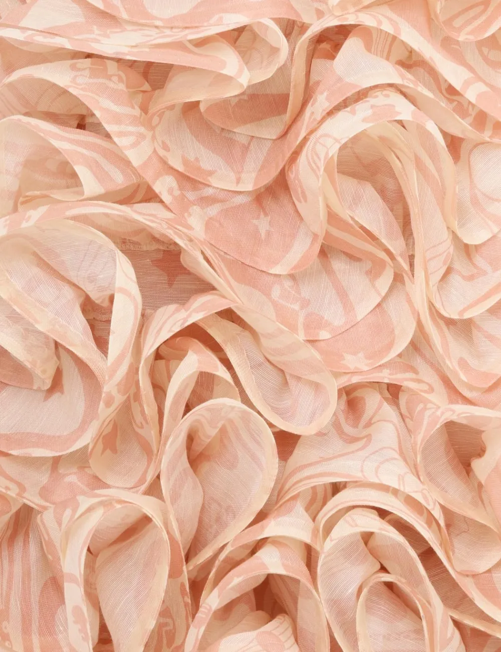 The Matchmaker Ruffle Mini Dress In Pink/Cream Abstract Musical From Our Resort 2024 Collection, Matchmaker. A Silk Linen Organza Mini Dress Featuring A Balconette Style Bodice, Finished With A Tiered, Ruffle Skirt.