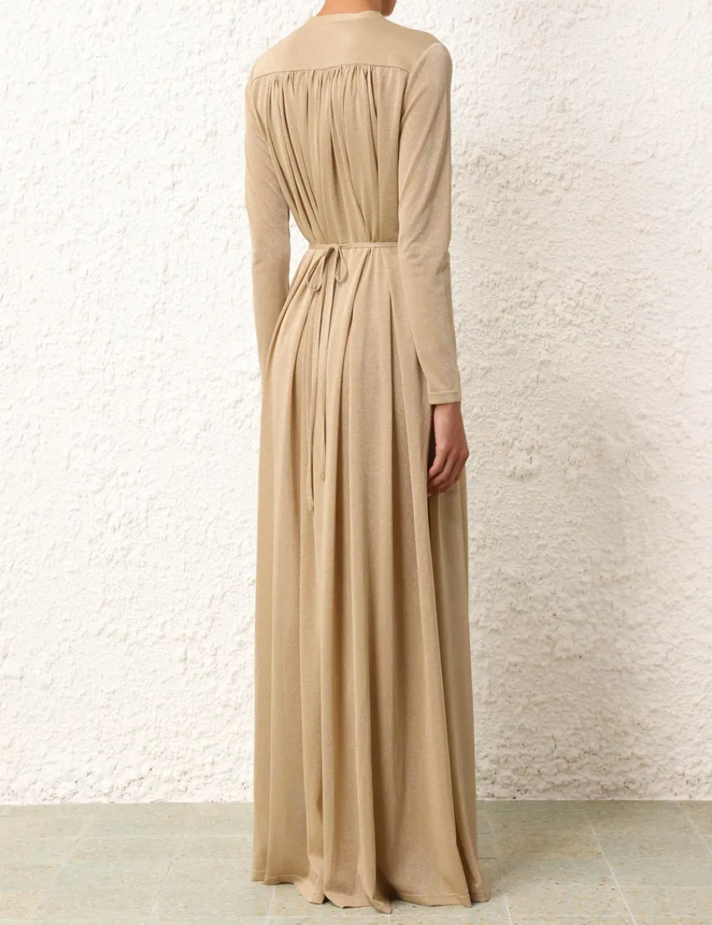 The Matchmaker Smock Dress In Gold From Our Resort 2024 Collection, Matchmaker. A Long Sleeved Maxi Dress Featuring A Deep V Neckline And Metallic Finish.