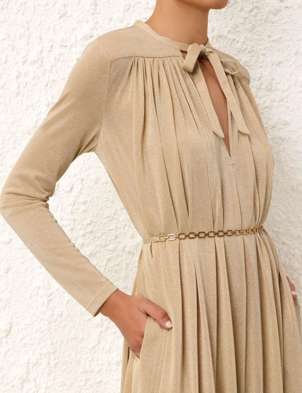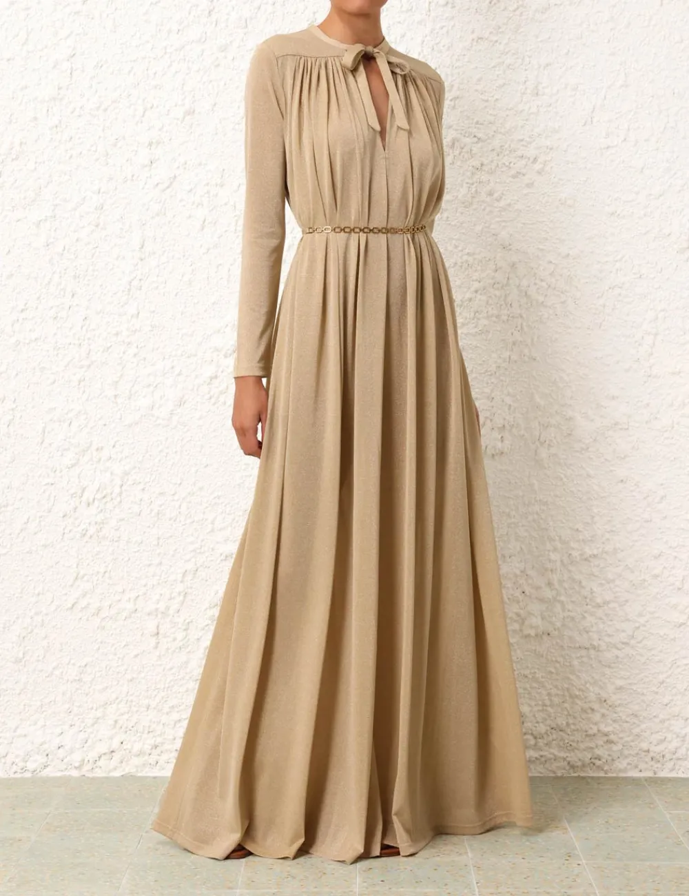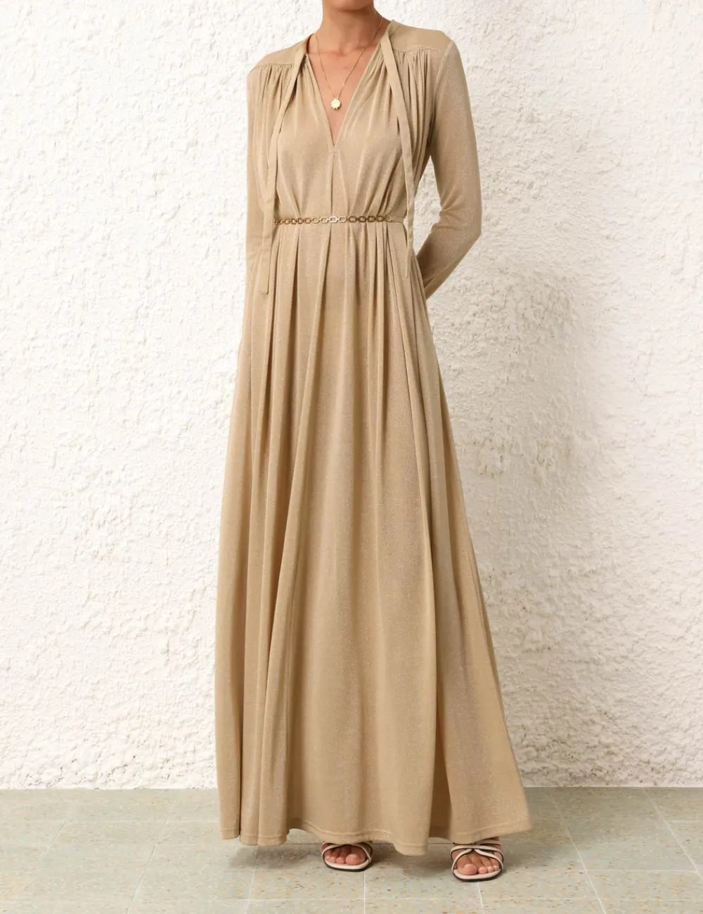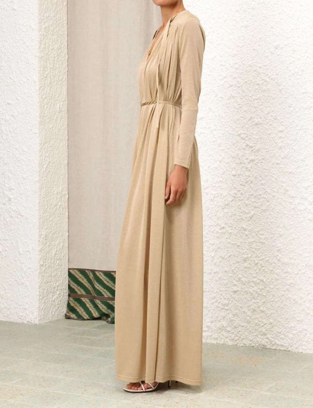 The Matchmaker Smock Dress In Gold From Our Resort 2024 Collection, Matchmaker. A Long Sleeved Maxi Dress Featuring A Deep V Neckline And Metallic Finish.