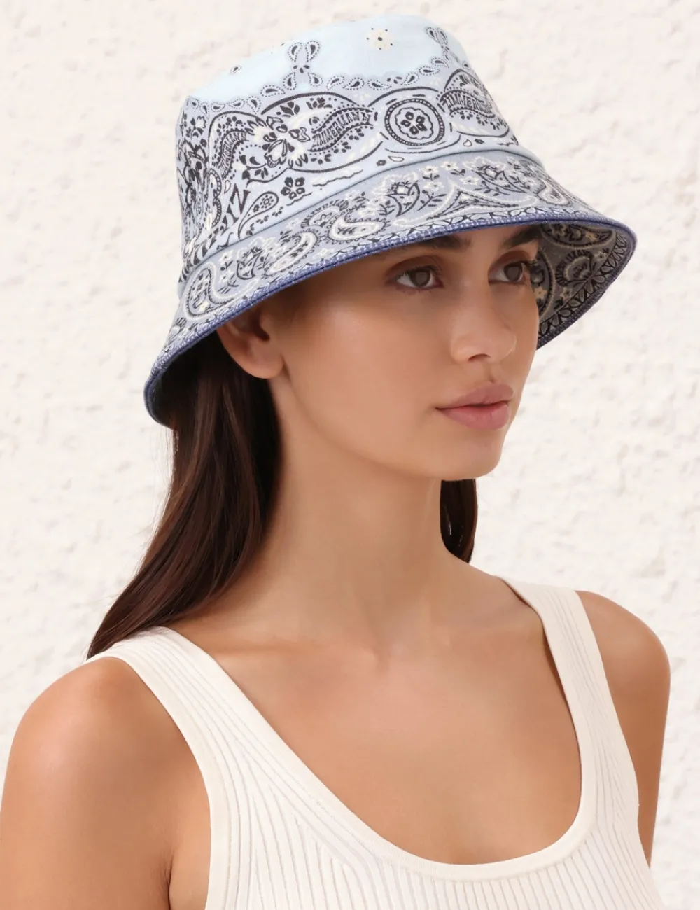 The Printed Canvas Bucket Hat In Blue Bandana From Our Resort 2024 Collection, Matchmaker. A Linen Bucket Hat Featuring Topstitching Around The Brim And Ventilation In The Crown.