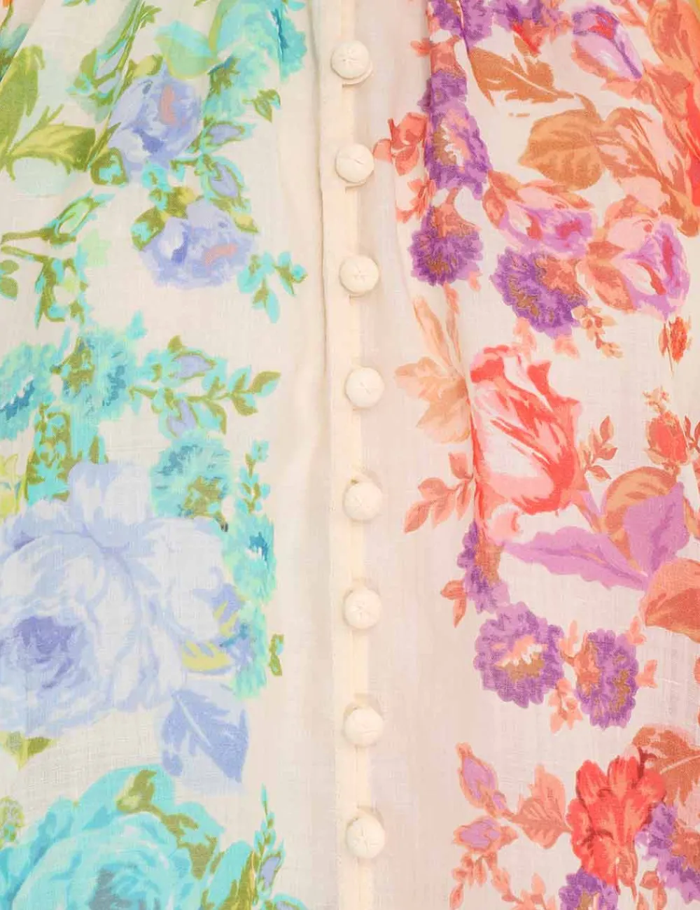The Raie Billow Blouse In Multi Floral From Our Summer Swim 2023 Collection. A Ramie Blouse Featuring Billow Sleeves And Self Cover Buttons Down The Centre Front.