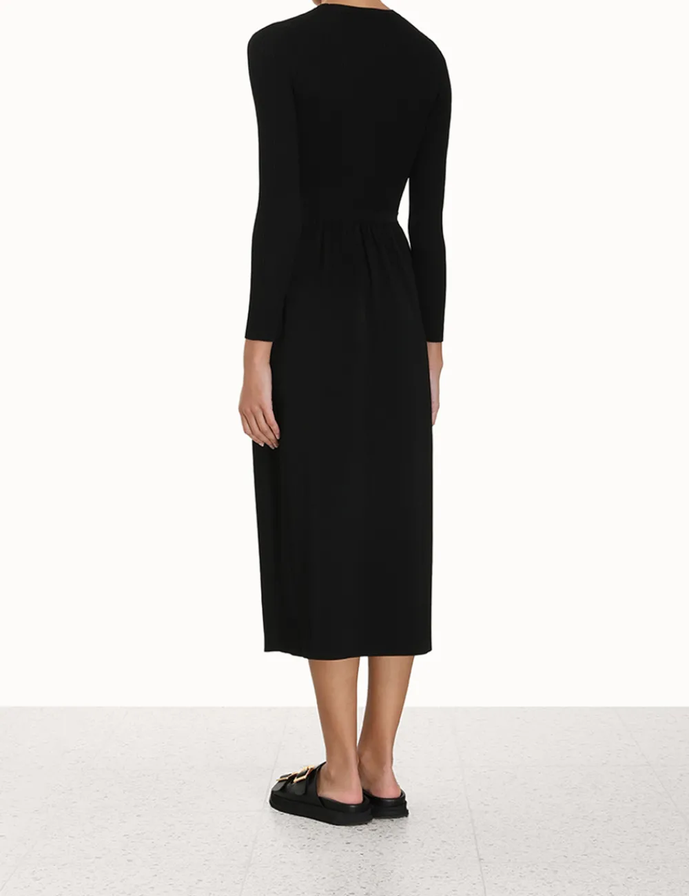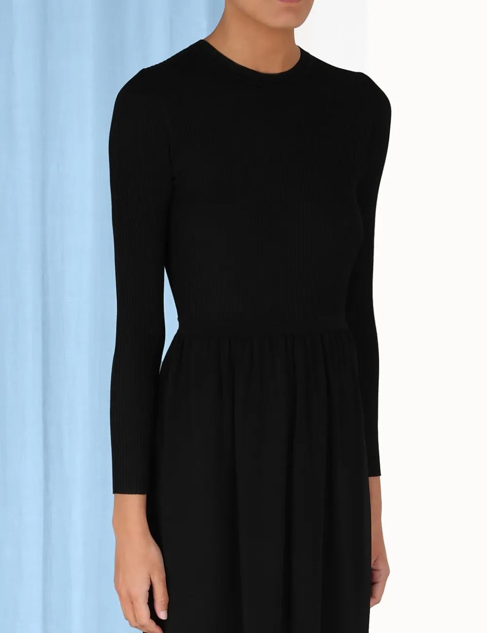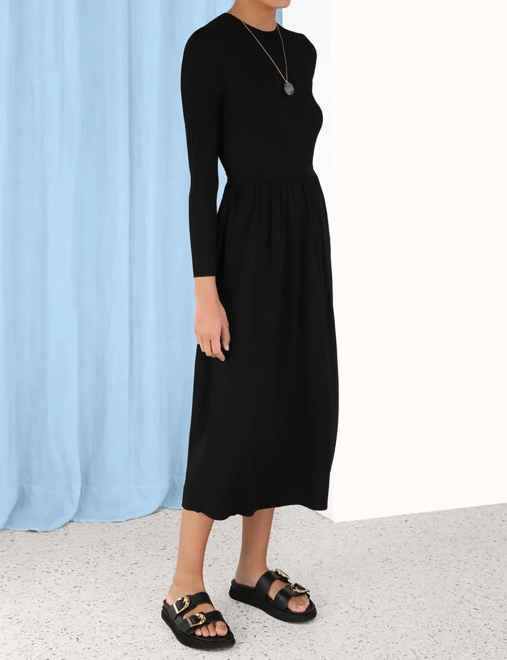 The Rib Midi Dress In Black From Our Fall 2023 Collection, Luminosity. A Knitted Midi Dress Featuring A Slightly Gathered Waist.