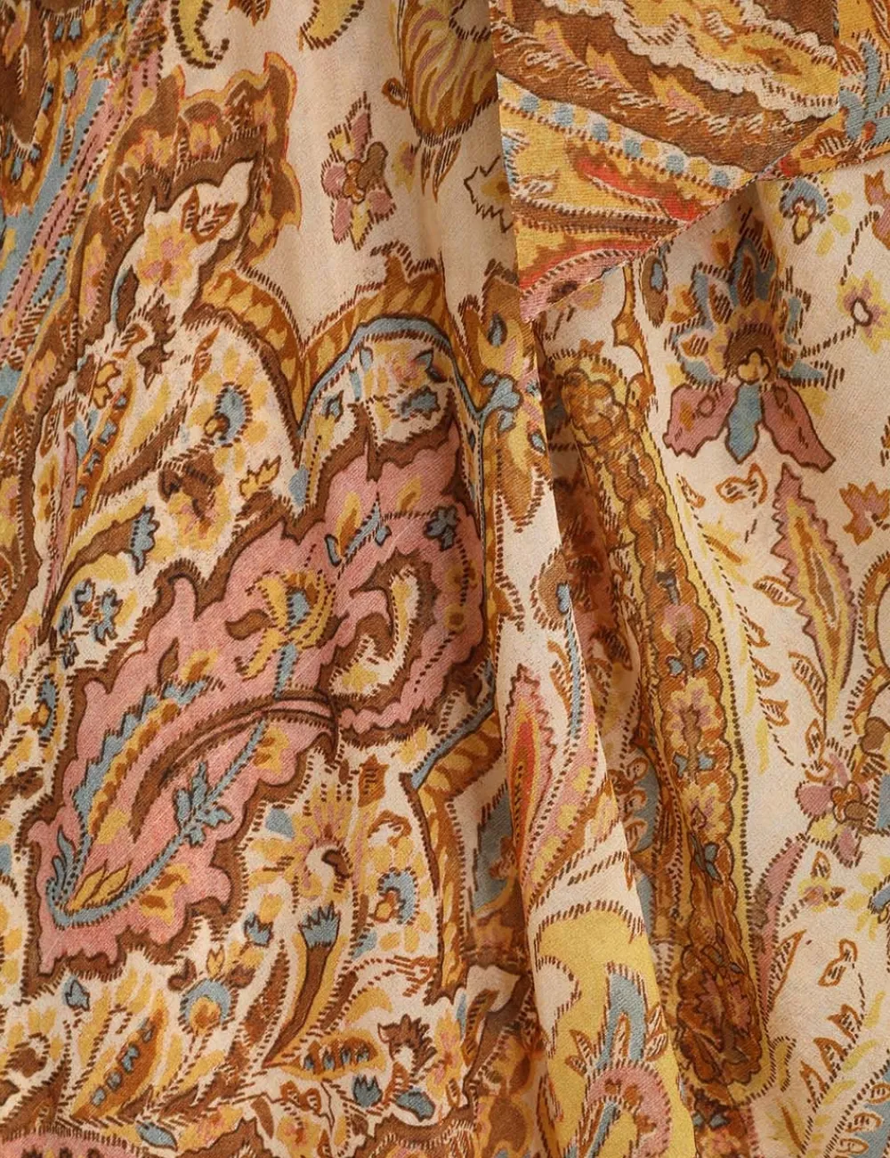 The Sensory Billow Dress In Paisley Gold Print From Our Fall 2023 Collection, Luminosity. A Long Sleeve Midi Dress Featuring A Cowl Neck And A Self Tie Neck.