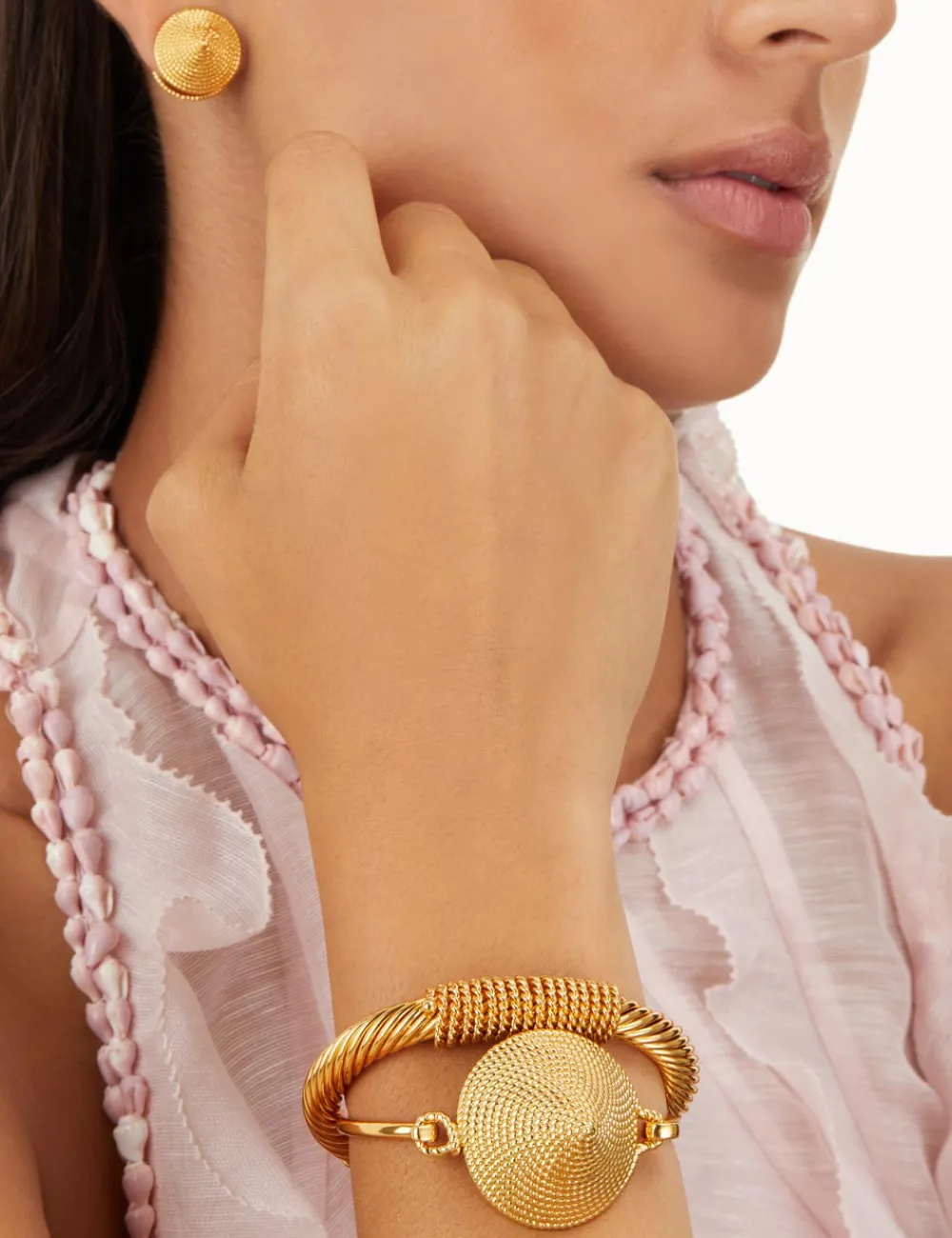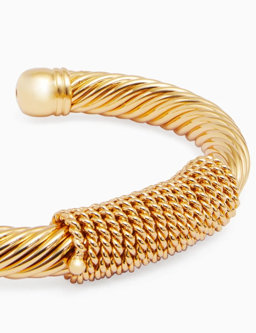 The Twisted Rope Cuff Gold From Our Spring 2023 Collection, Wonderland. A Gold Plated Cuff With Rope Look Detailing.