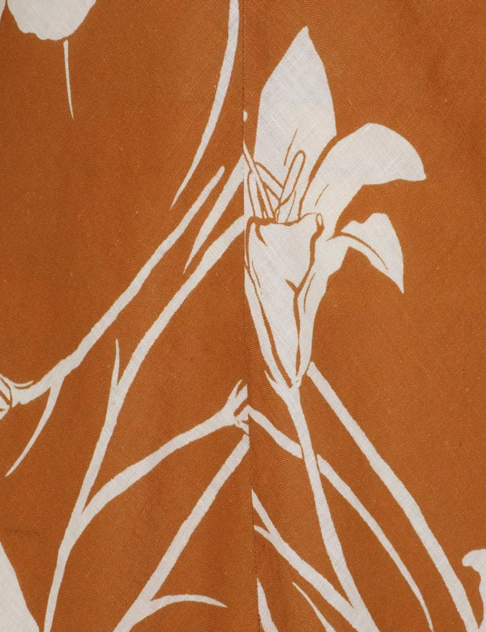 The Acadian High Neck Dress In Tan/Ivory Floral From Our Resort Swim 2024 Collection. A Linen Midi Dress Featuring A High Neck Design With A Piping Detail Along The Waistband.