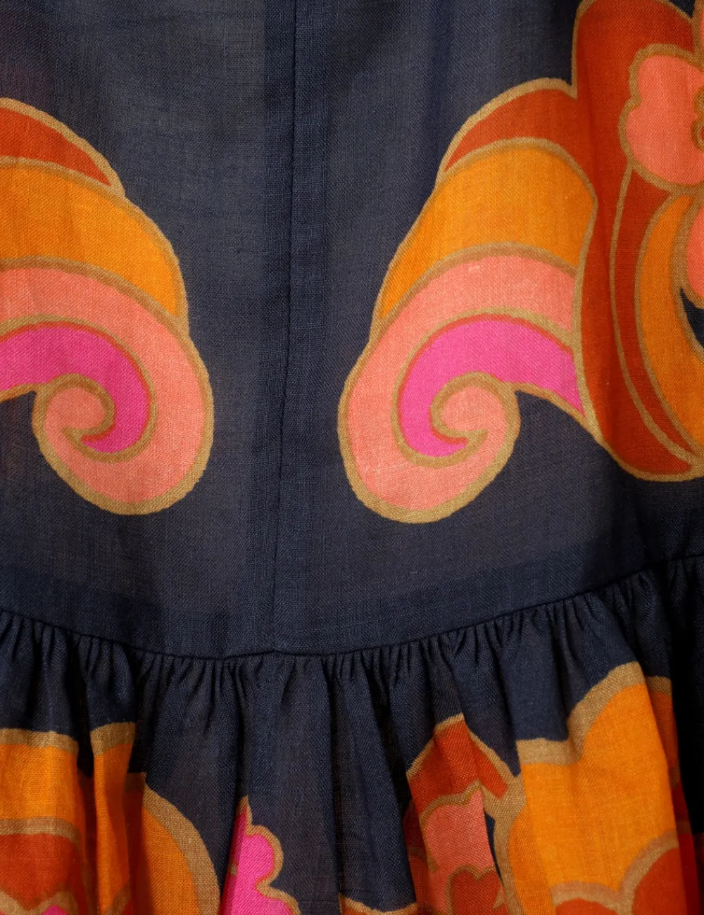 The Acadian Lantern Mini Dress In Navy Paisley From Our Resort Swim 2024 Collection. A Ramie Mini Dress Featuring A Shirred Neck And Cuffs And Placement Print Throughout.