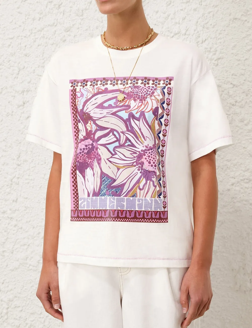 The Acadian Printed Relaxed Tee In Light Cream From Our Resort Swim 2024 Collection. A Cotton Tee Featuring A Zimmermann Print.