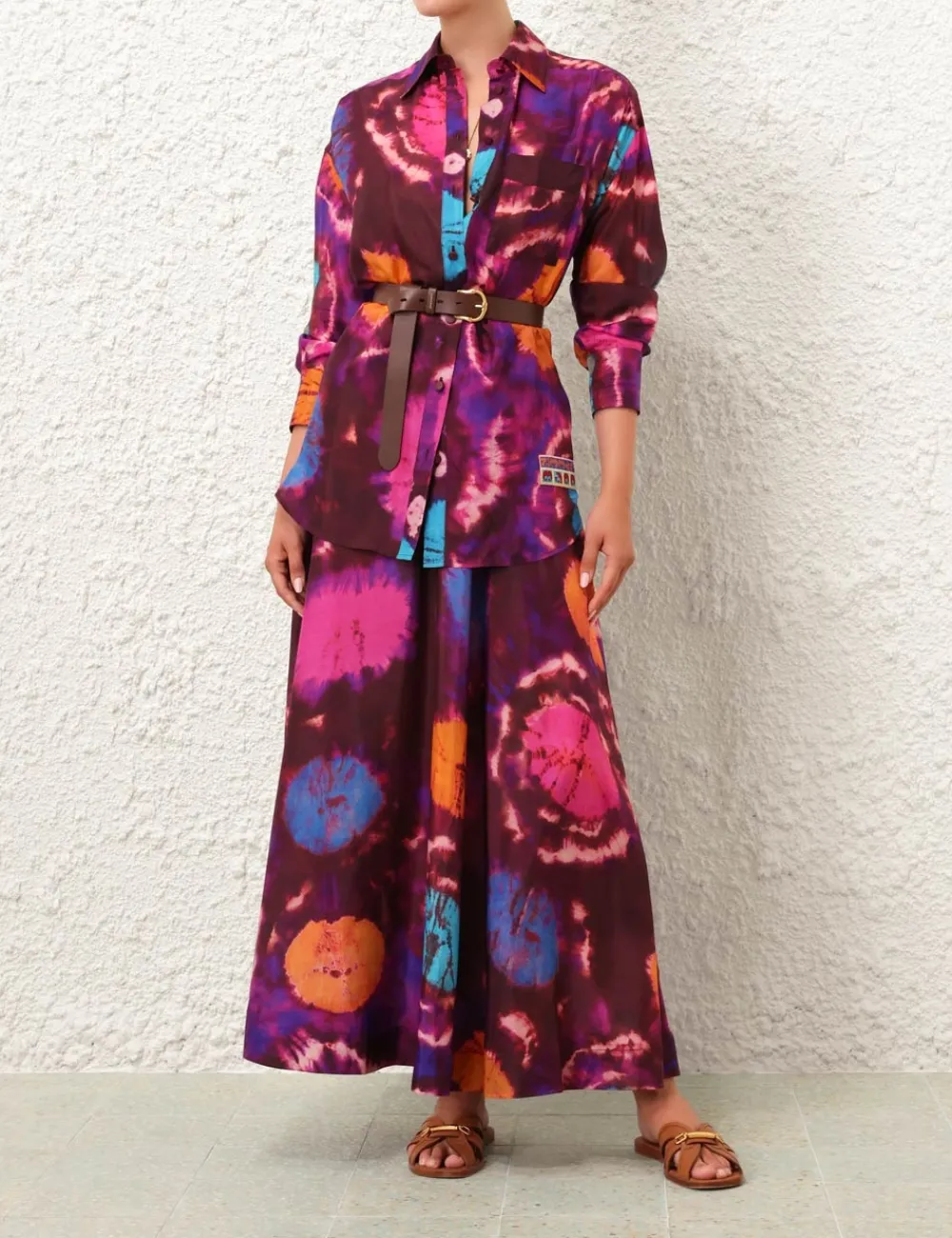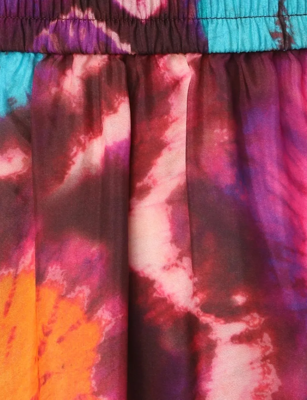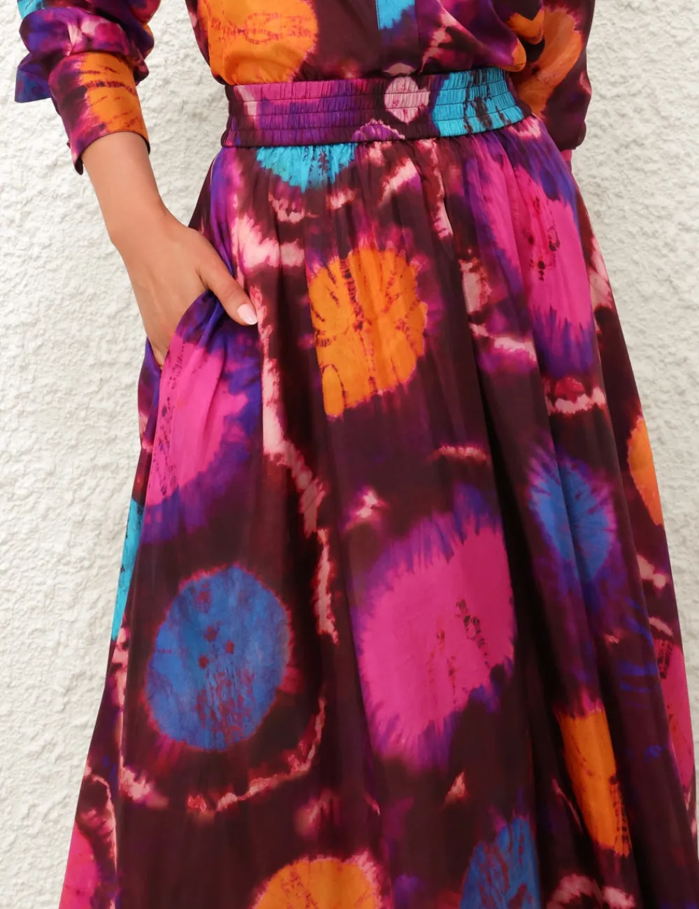 The Acadian Swing Skirt In Tie Dye Multi From Our Resort Swim 2024 Collection. A Silk Swing Midi Skirt Featuring An Elasticated Waistband And Side Seam Pockets.