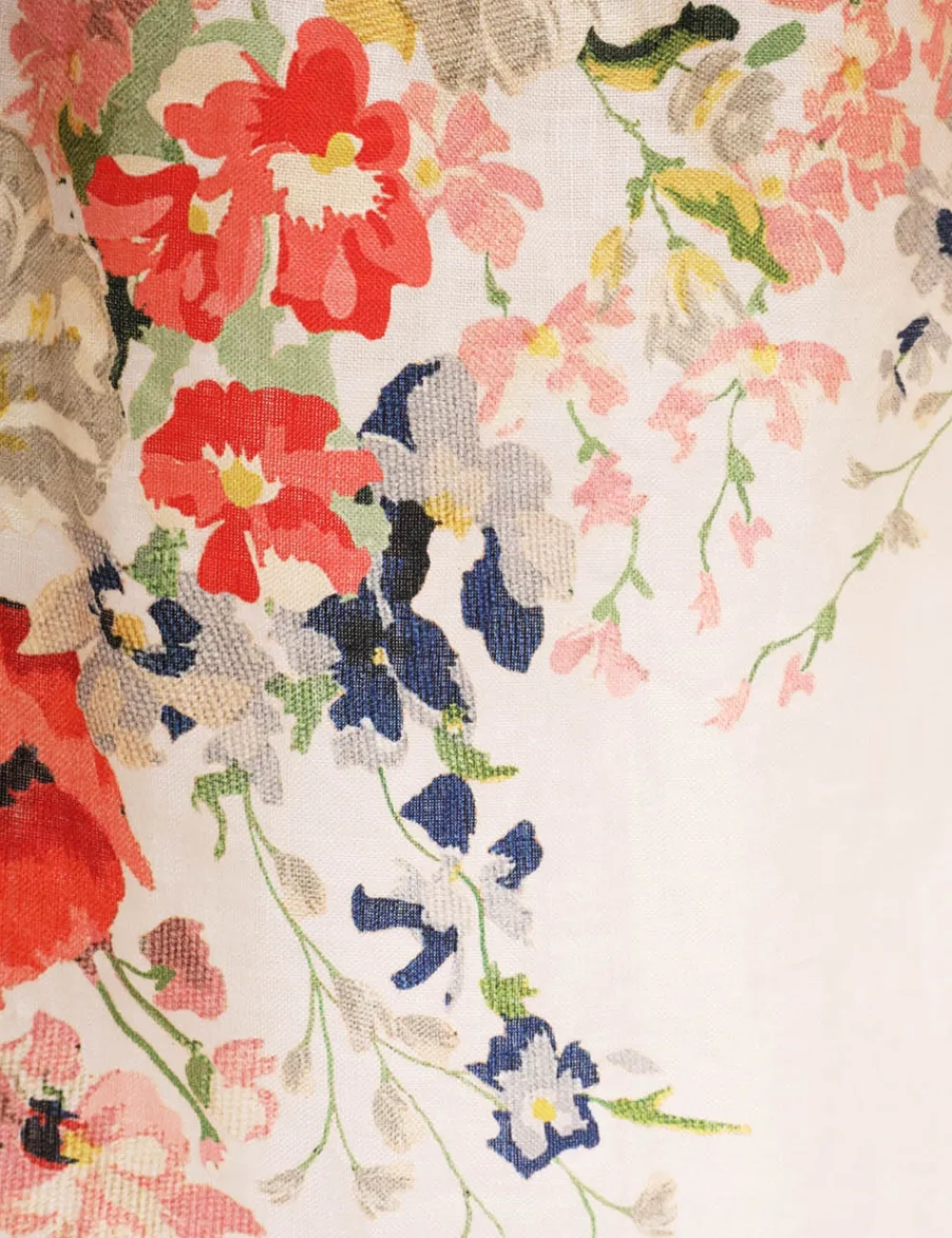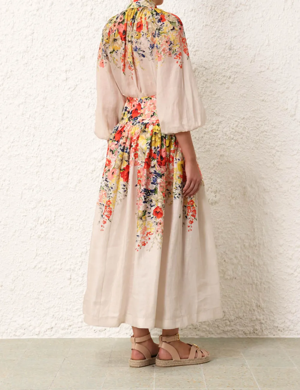 The Alight Midi Skirt In Ivory Floral From Our Resort Swim 2024 Collection. A Linen Midi Skirt Featuring A Wide Waistband And Side Seam Pockets.