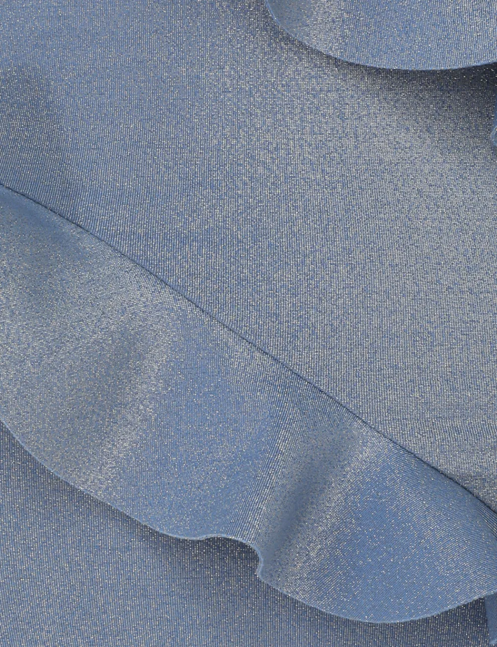 The August Asymmetric Frill 1Pc In Dusty Blue From Our Resort Swim 2024 Collection. A Lurex Lycra One Piece Featuring Bonded Frills And Boning In The Side Seams.