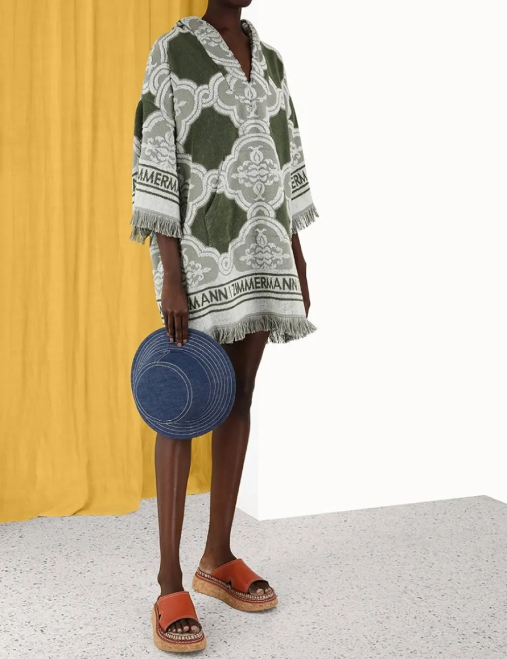 The Chintz Hooded Towel Mini Dress In Khaki From Our Summer Swim 2023 Collection. A Cotton Hooded Robe Featuring A Kangaroo Pocket, Oversized Hood And Fringed Hems.