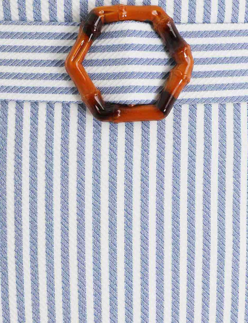 The Chintz Stripe High Waist Pant In Cream/Blue Stripe From Our Summer Swim 2023 Collection. A High Waisted Bikini Pant Constructed From Italian Lycra Featuring A Removable Self Cover Belt With A Tortoiseshell Buckle.