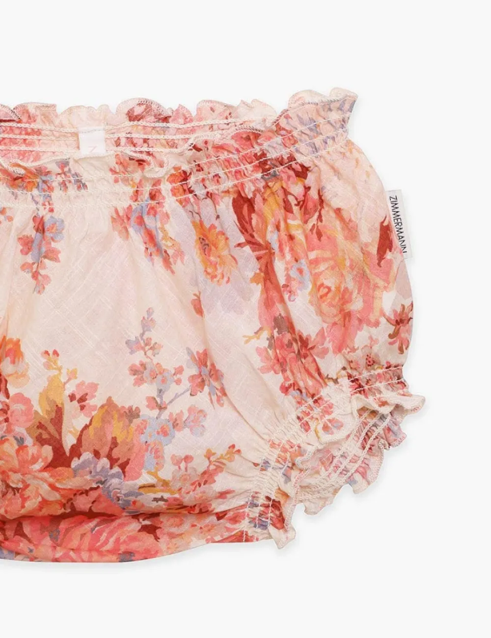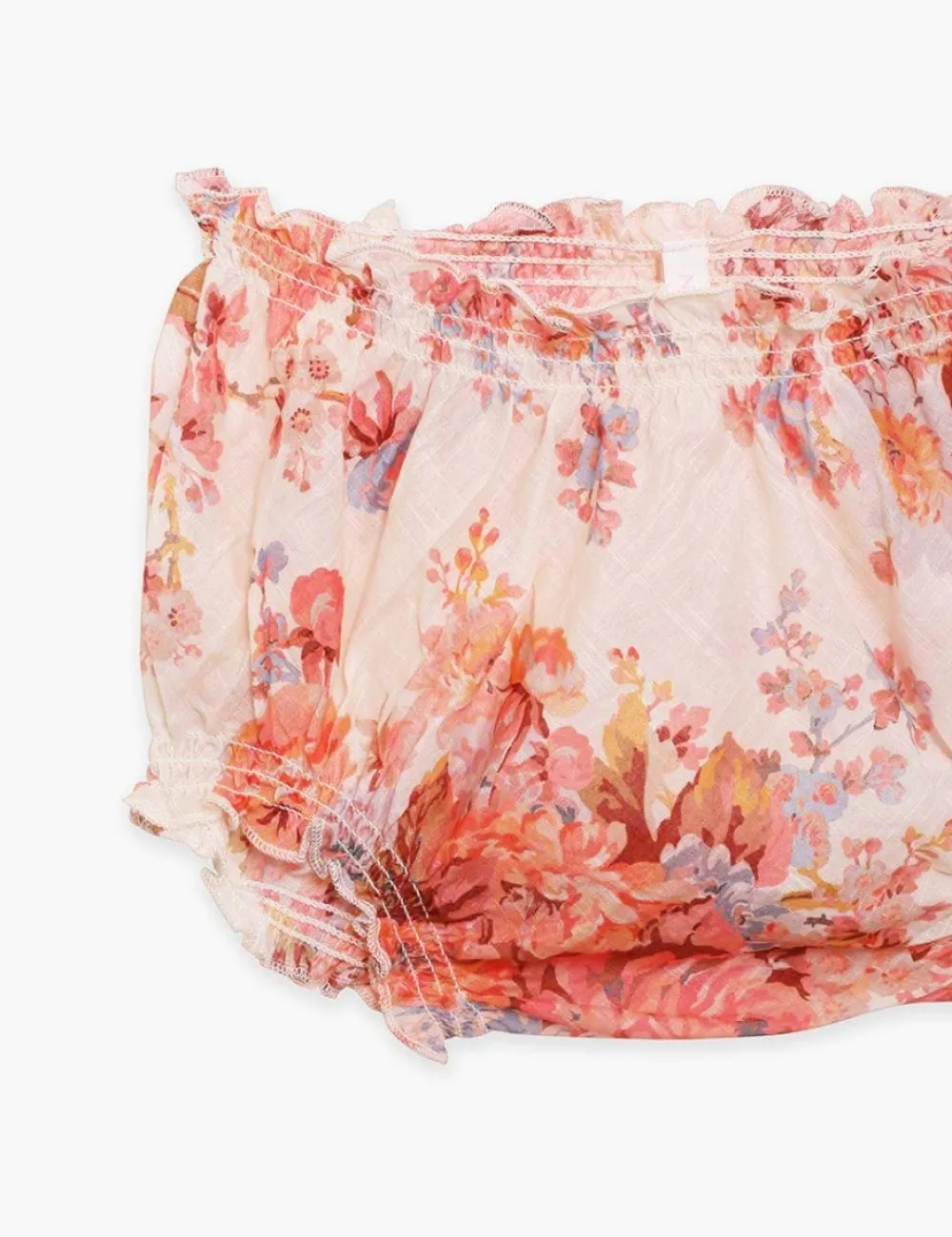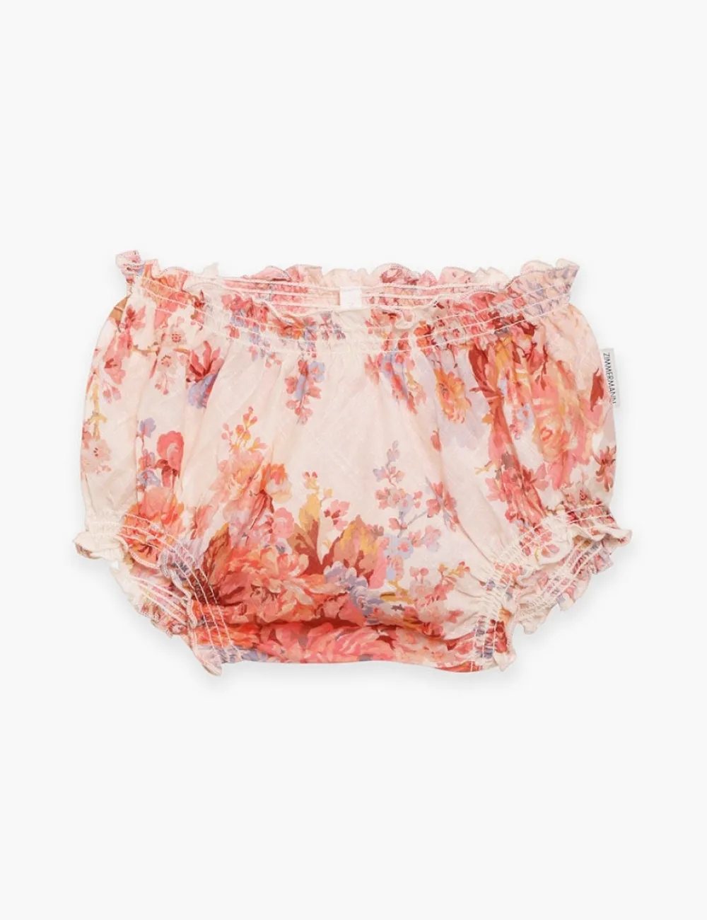 The Devi Bloomer In Cream Floral From Our Summer Swim 2023 Collection. A Cotton Bloomer With Elastic Trims And Frilled Edges.