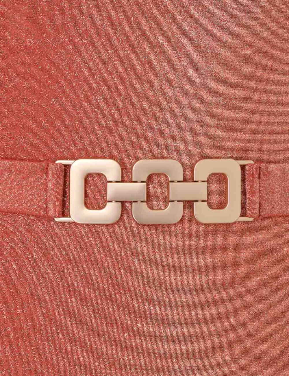 The Devi Lurex Chain Link 1Pc In Coral From Our Summer Swim 2023 Collection. A Lurex Lycra Bandeau One Piece Featuring Boning In The Side Seams, A Shelf Bra And A Removable Self Cover Belt With Chain Link Detailing.
