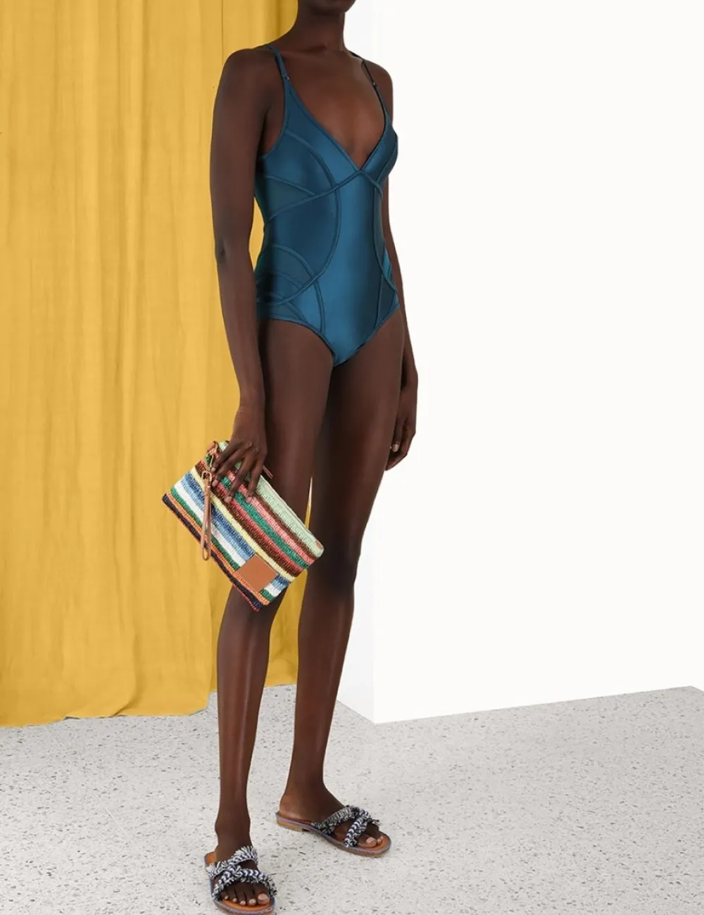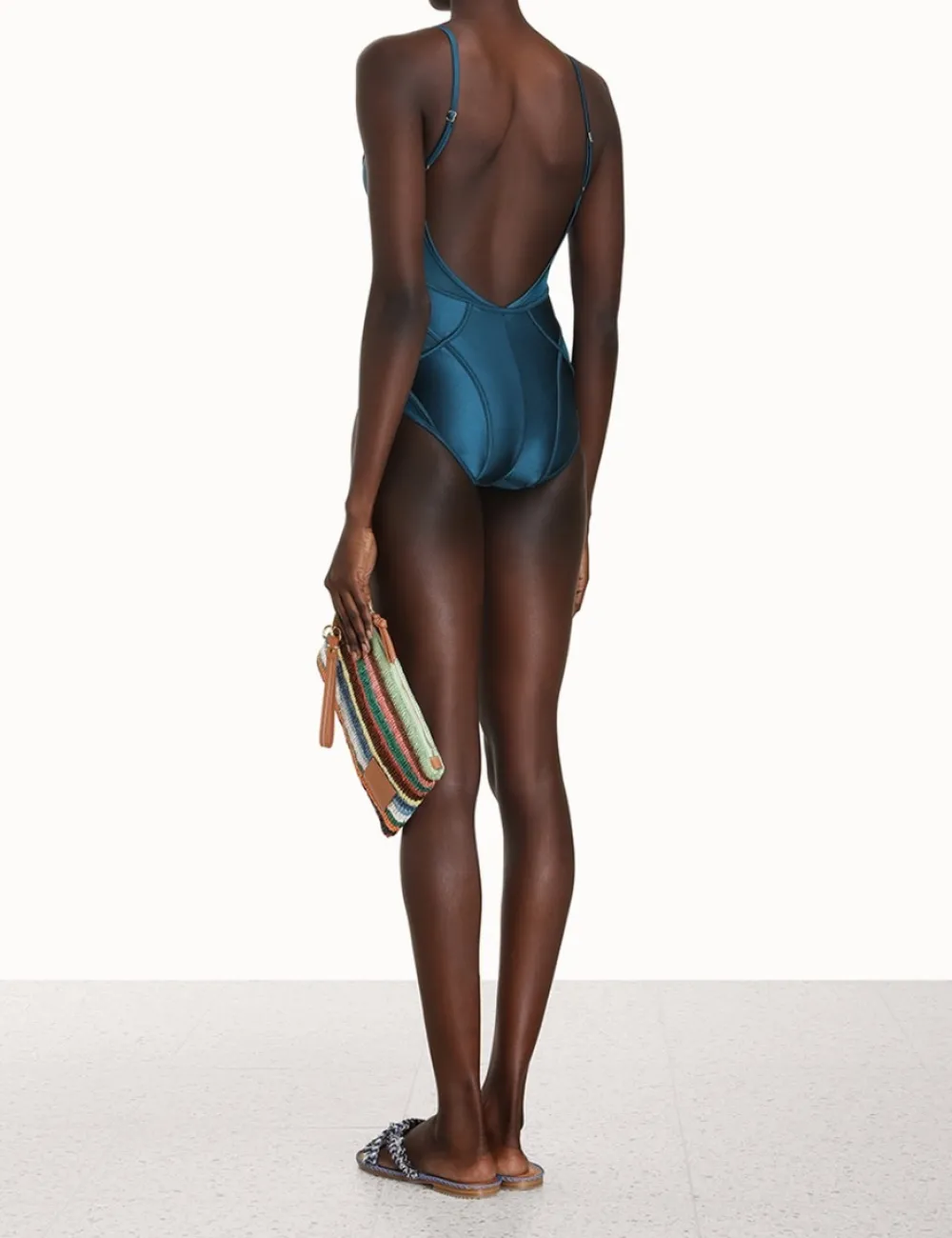 The Devi Panelled Mesh 1Pc In Teal From Our Summer Swim 2023 Collection. A Shiny Lycra One Piece Featuring Mesh Panels And Adjustable Straps.