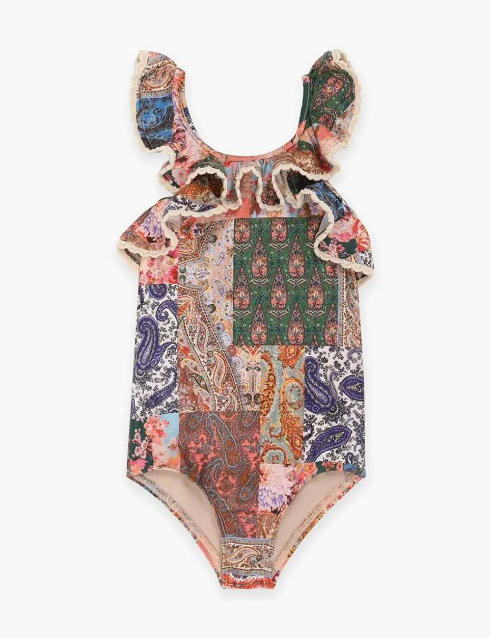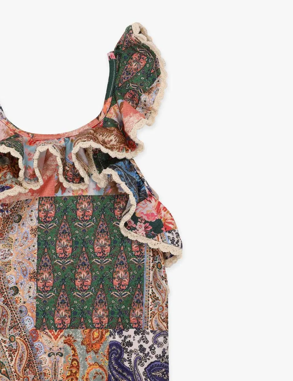 The Devi Trim Frill 1Pc In Patch Paisley From Our Summer Swim 2023 Collection. A Lycra One Piece Featuring Frills Throughout And A Cross Over Back.