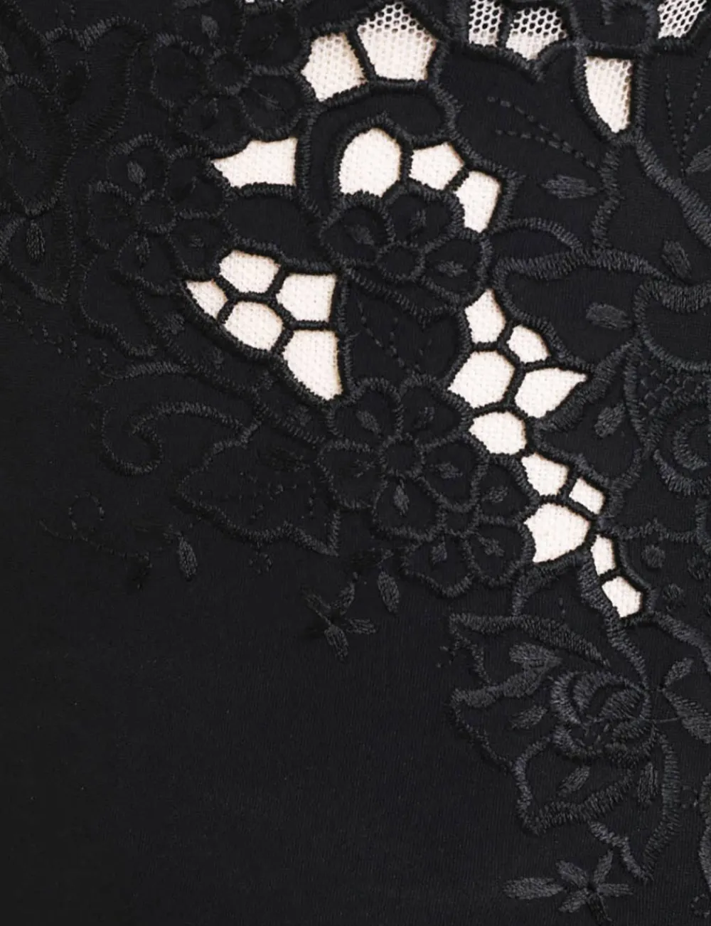 The Ginger Embroidered Bikini In Noir From Our Summer Swim 2023 Collection. A Lycra Bikini Featuring Placement Embroidery, Nude Mesh Lining, Side Seam Boning In The Bra, And A High Waisted Pant.