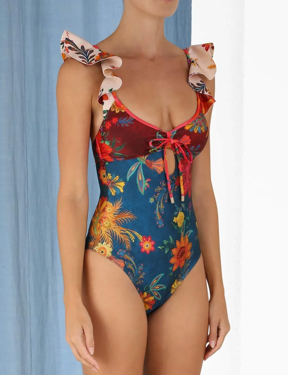 The Ginger Frill Shoulder 1Pc In Spliced From Our Summer Swim 2023 Collection. An Italian Lycra One Piece Featuring A Frilled Shoulders And Tie Front Bust.