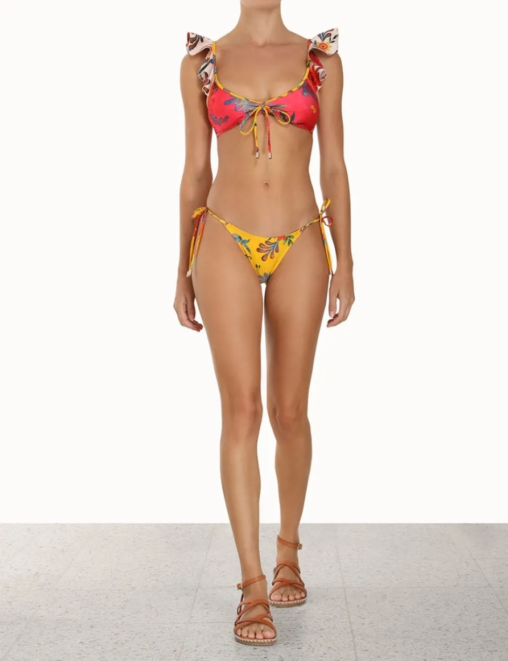 The Ginger Frill Shoulder Bikini In Spliced From Our Summer Swim 2023 Collection. An Italian Lycra Bikini Set Featuring A Top With Frilled Shoulders And Low Rise Pants With Self Tie Sides.