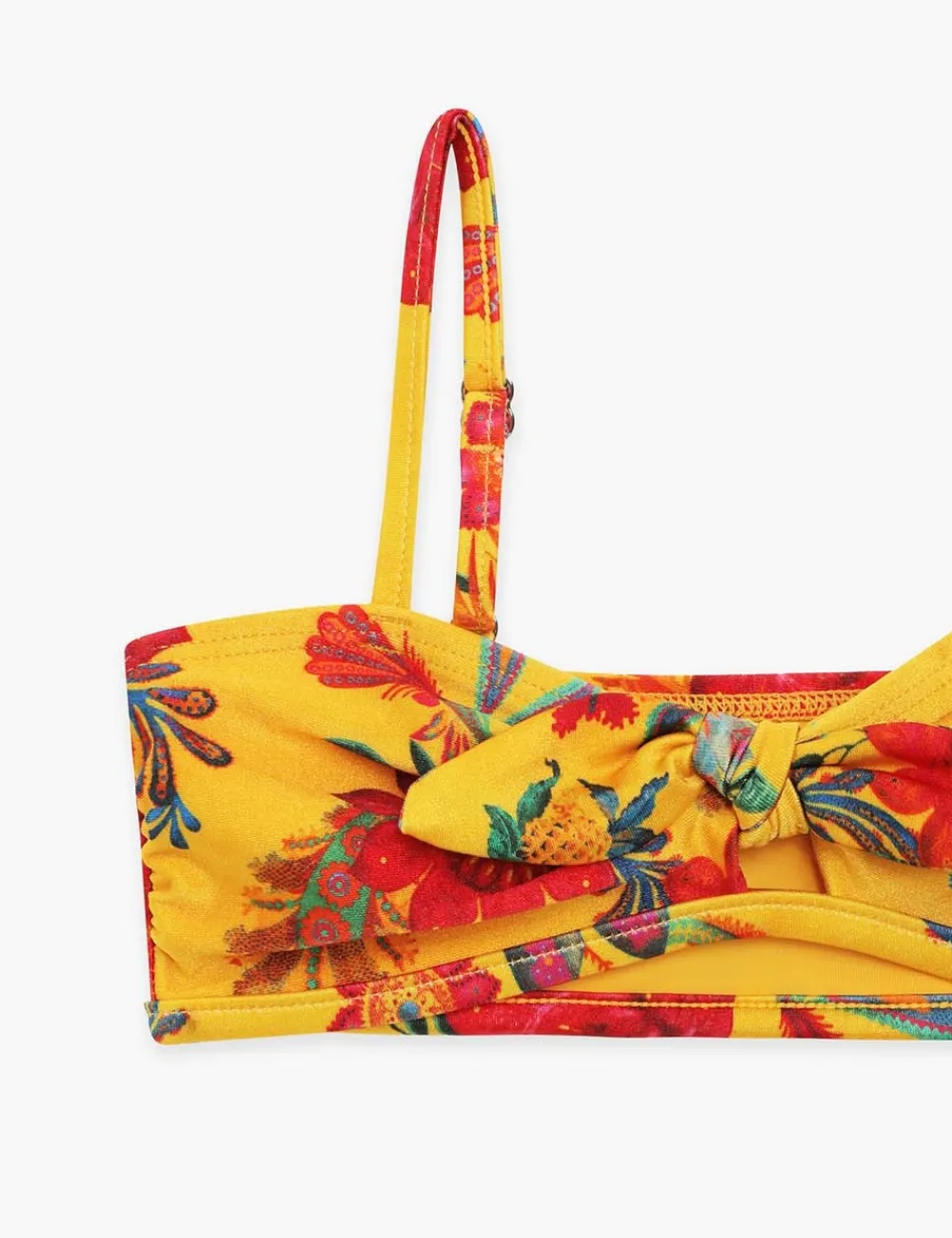 The Ginger Tie Bikini In Yellow Floral From Our Summer Swim 2023 Collection. An Italian Lycra Bikini Set Featuring Bow Details On The Top And Pant Sides.