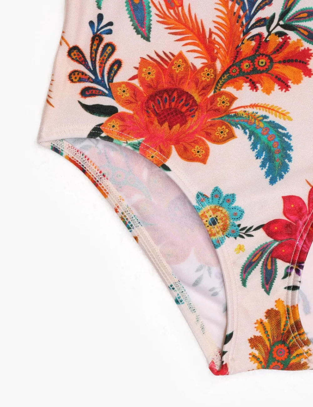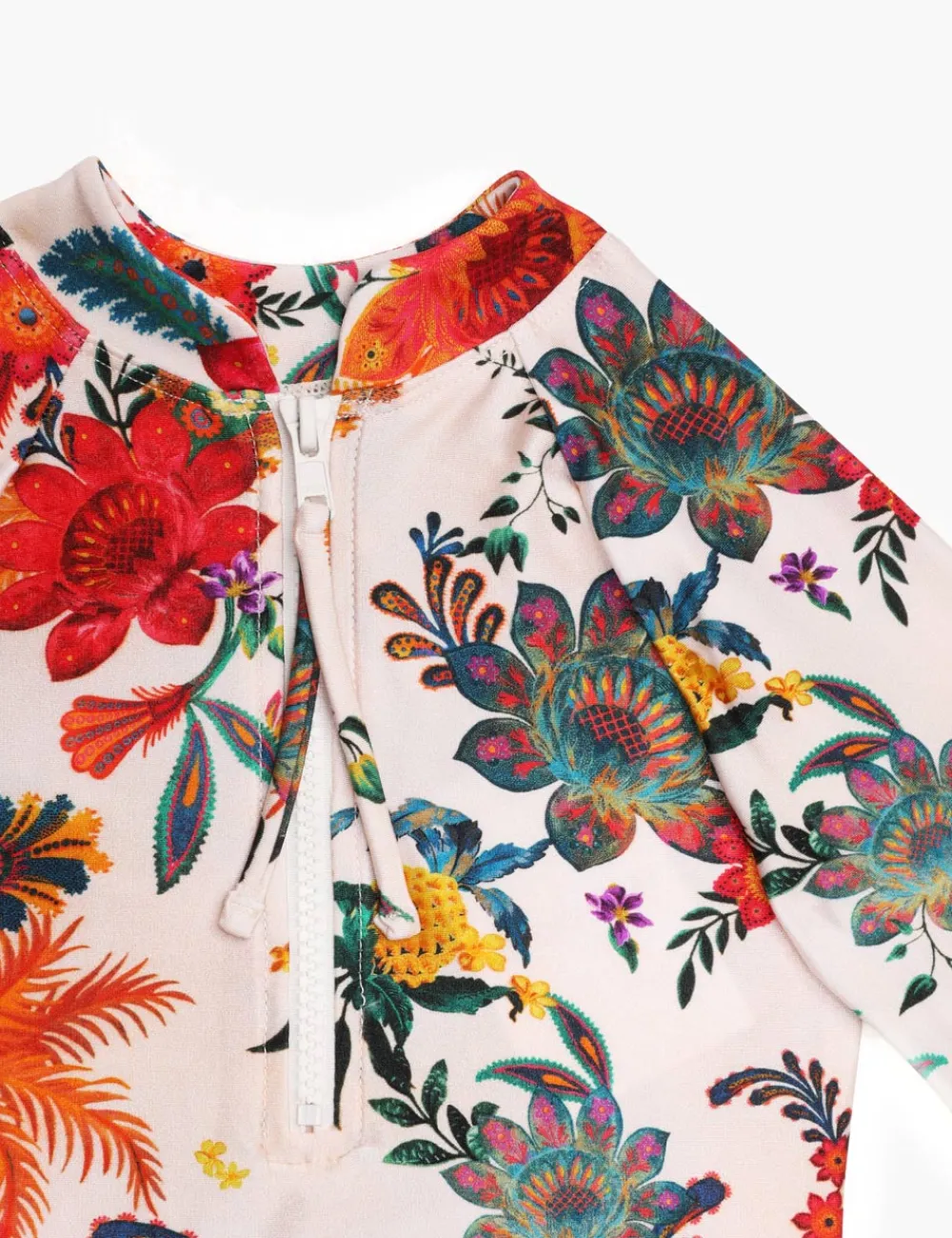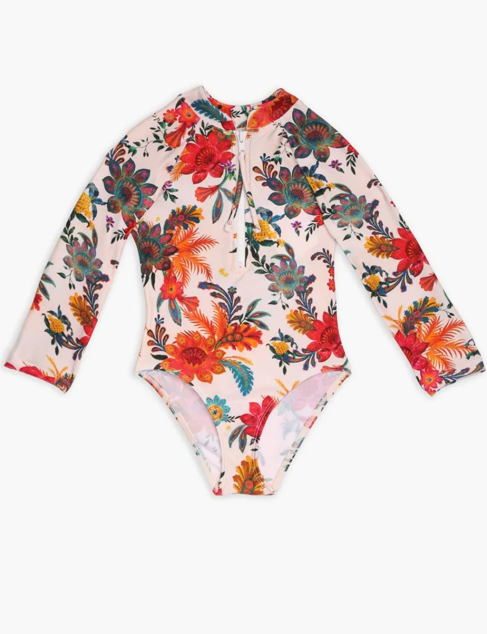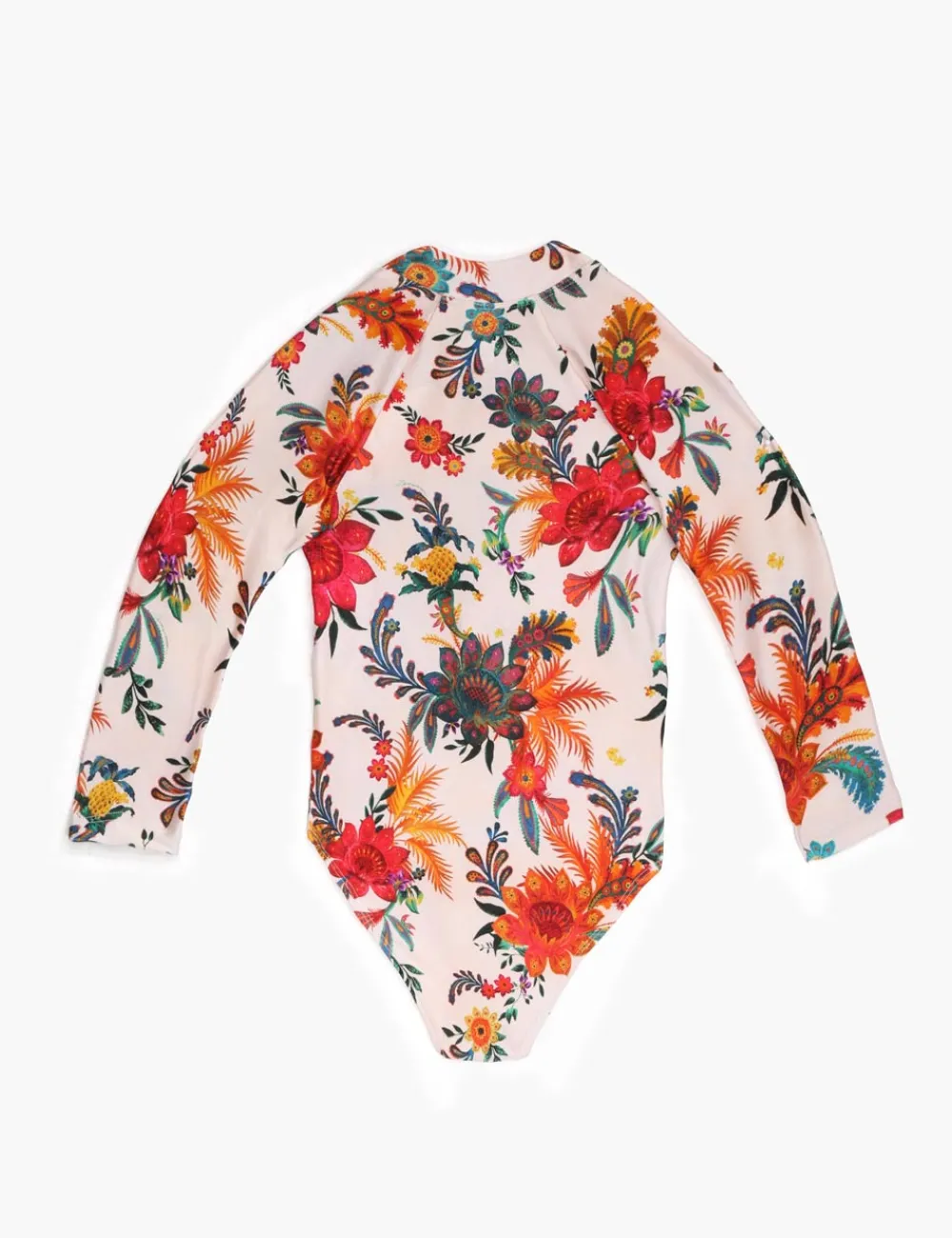 The Ginger Zip Front 1Pc In Ivory Floral From Our Summer Swim 2023 Collection. A Lycra One Piece Featuring A Long Sleeve And Centre Front Zip.