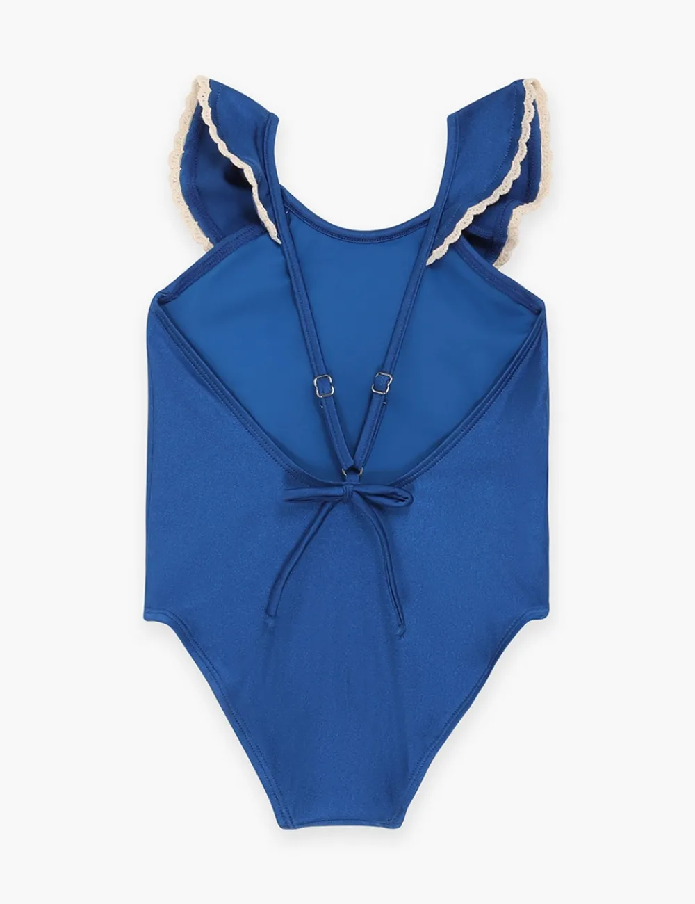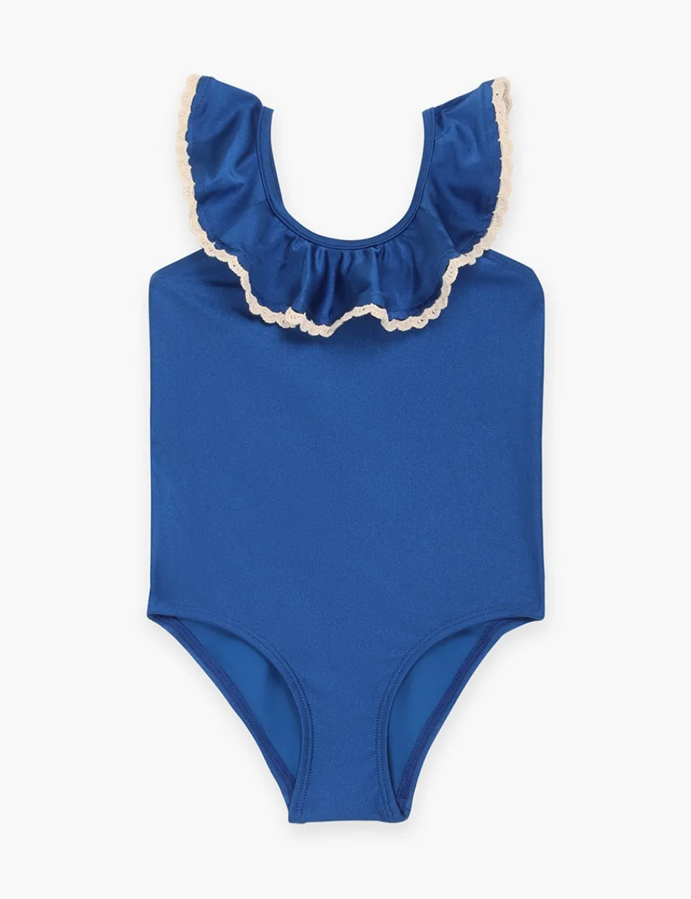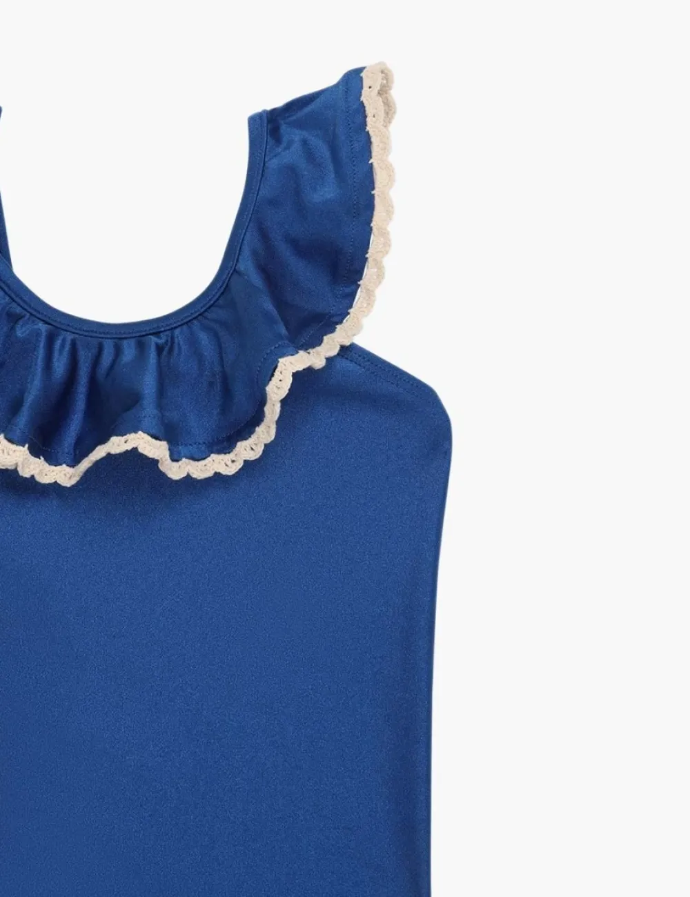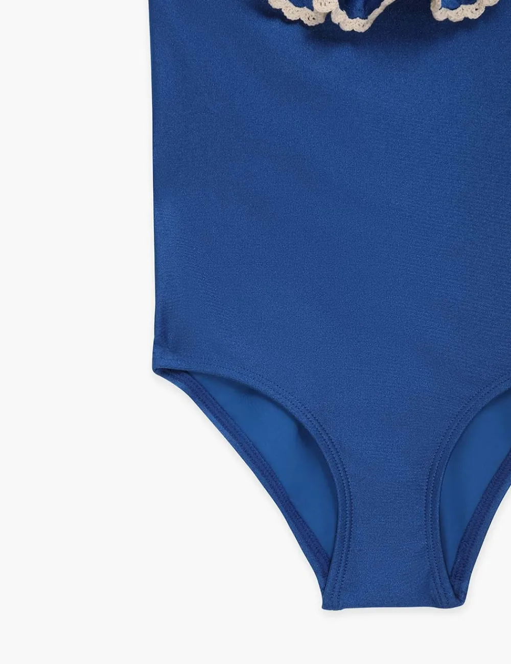 The Halcyon Trim Scoop 1Pc In Dusty Blue From Our Summer Swim 2023 Collection. An Italian Lycra One Piece Featuring Frilled Shoulders And Neckline With Crochet Edging.