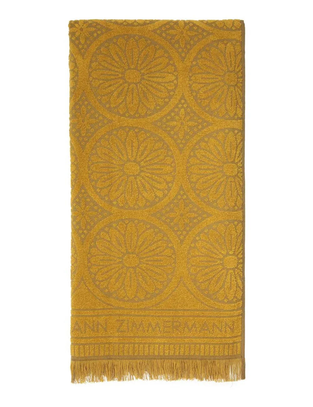 The Jacquard Towel In Gold From Our Resort 2024 Collection, Matchmaker. A Cotton Jacquard Towel With Fringed Edging And Branded Ends.