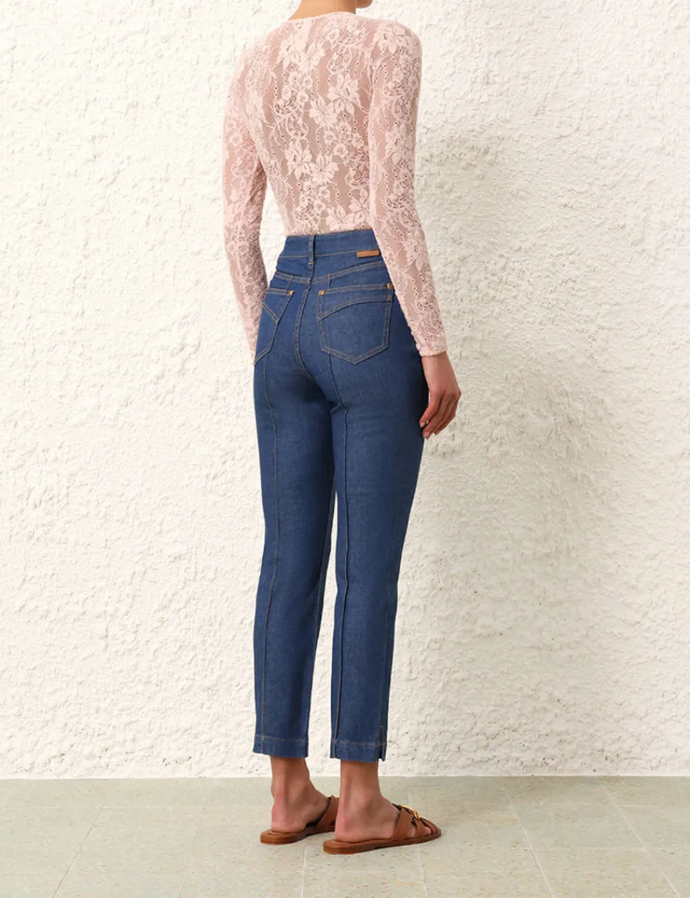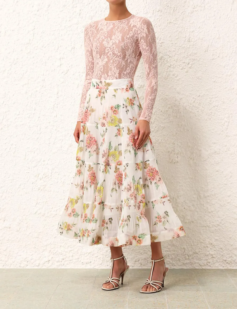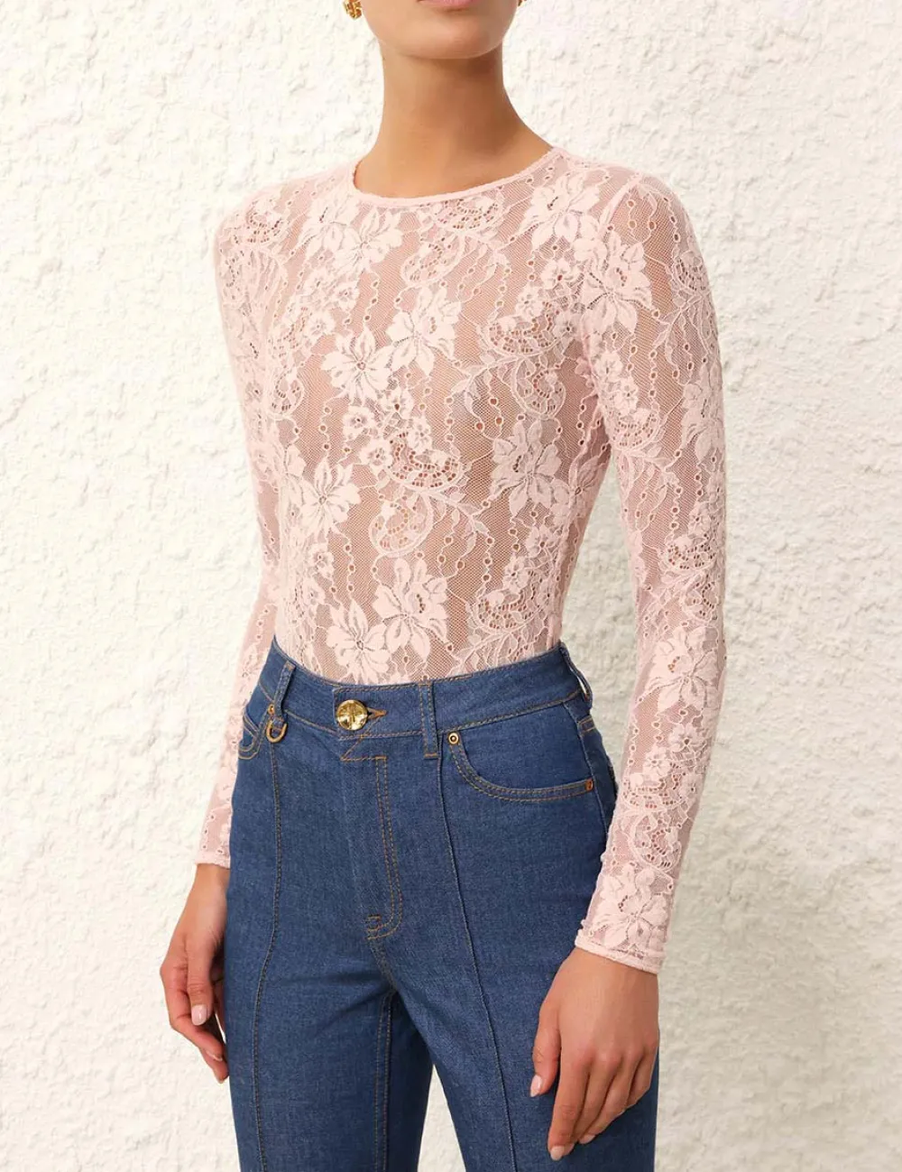 The Lace Bodysuit In Blush From Our Resort 2024 Collection, Matchmaker. A Lace Bodysuit Featuring A Crew Neck And Long Sleeves.
