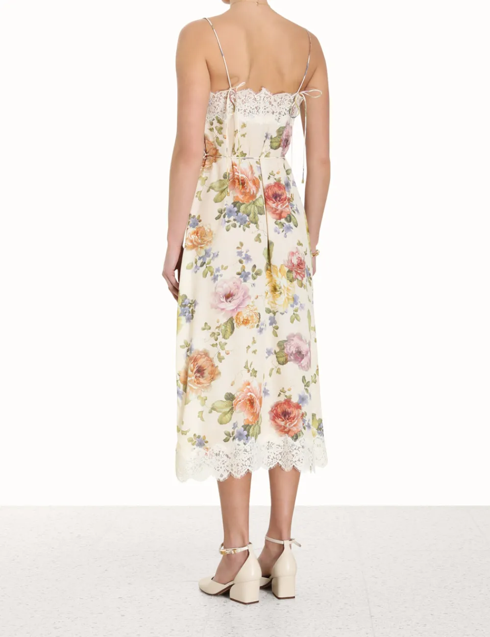 The Lace Panel Slip Midi In Multi Floral Cream From Our Fall 2023 Collection, Luminosity. A Slip Midi Dress Constructed From Lace Panels.