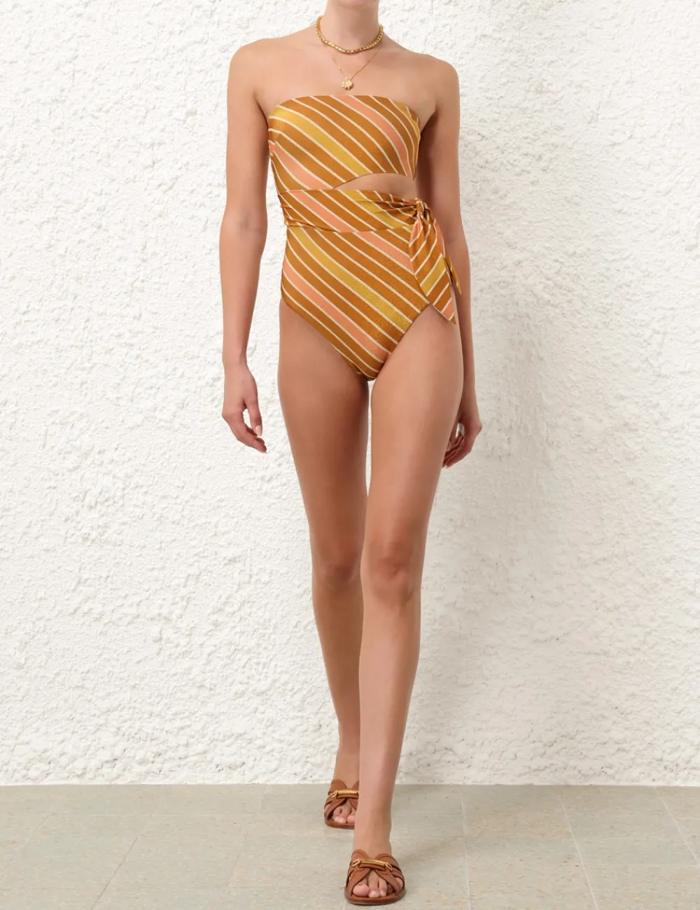 The Lexi Lurex Scarf Tie 1Pc In Caramel Lurex Multi Stripe From Our Resort Swim 2024 Collection. A Lycra Bandeau Style One Piece Featuring A Cutaway Waist With A Scarf Tie Detail.