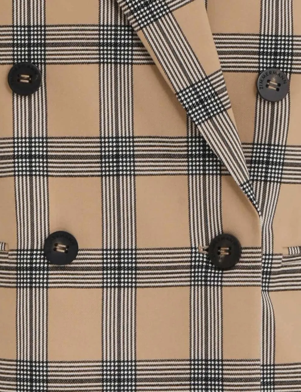 The Luminosity Oversized Jacket In Tan Checkfrom Our Fall 2023 Collection, Luminosity. A Longline Jacket Featuring Shoulder Pads And A Double Breasted Closure.