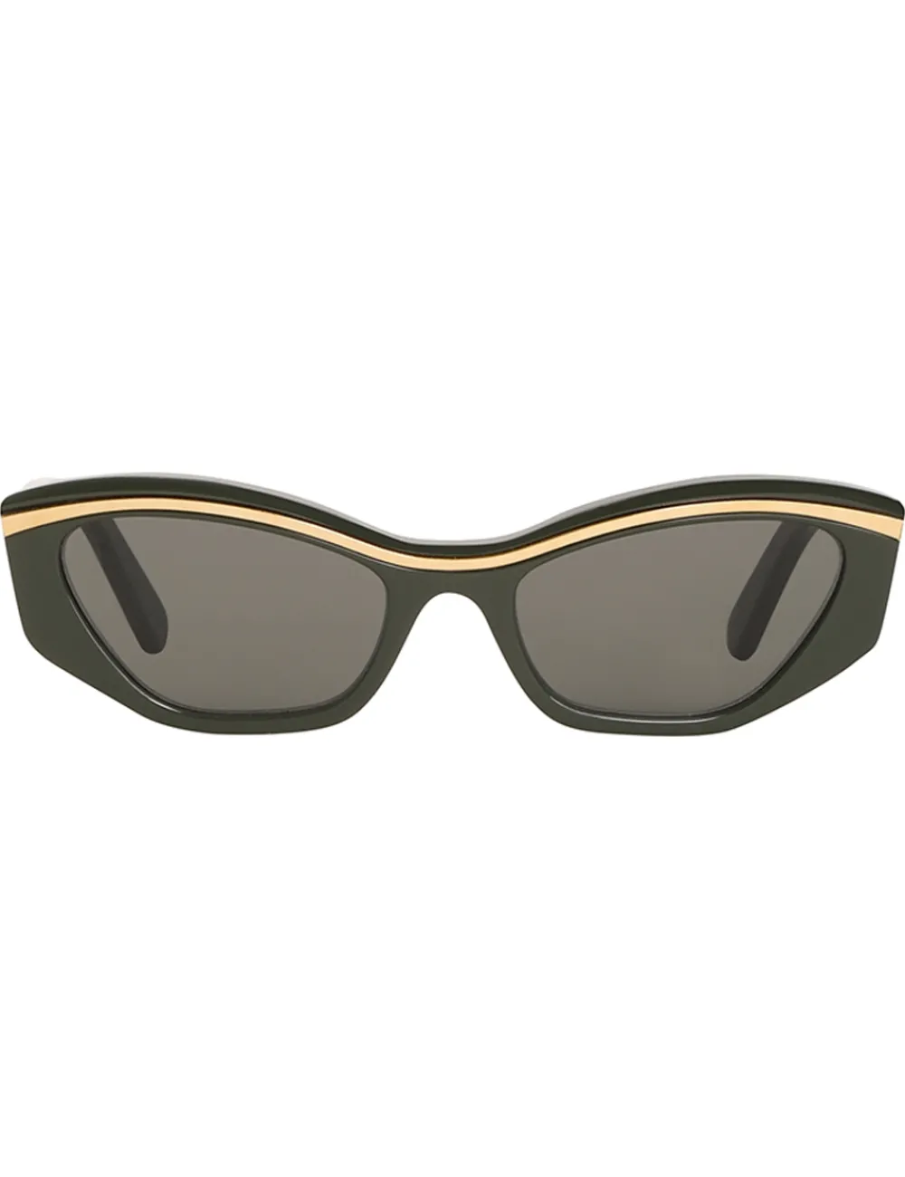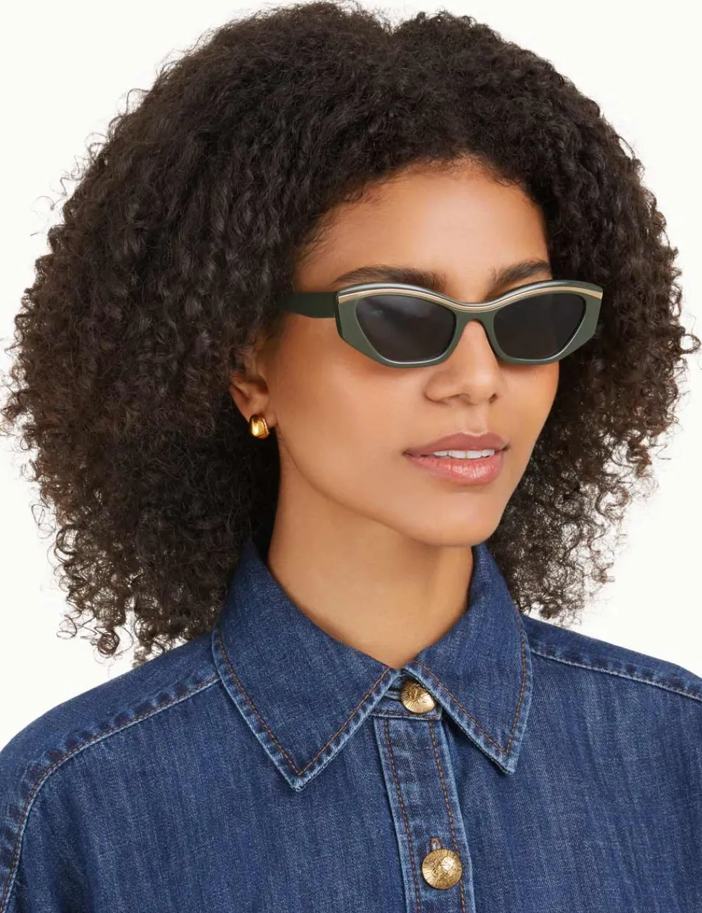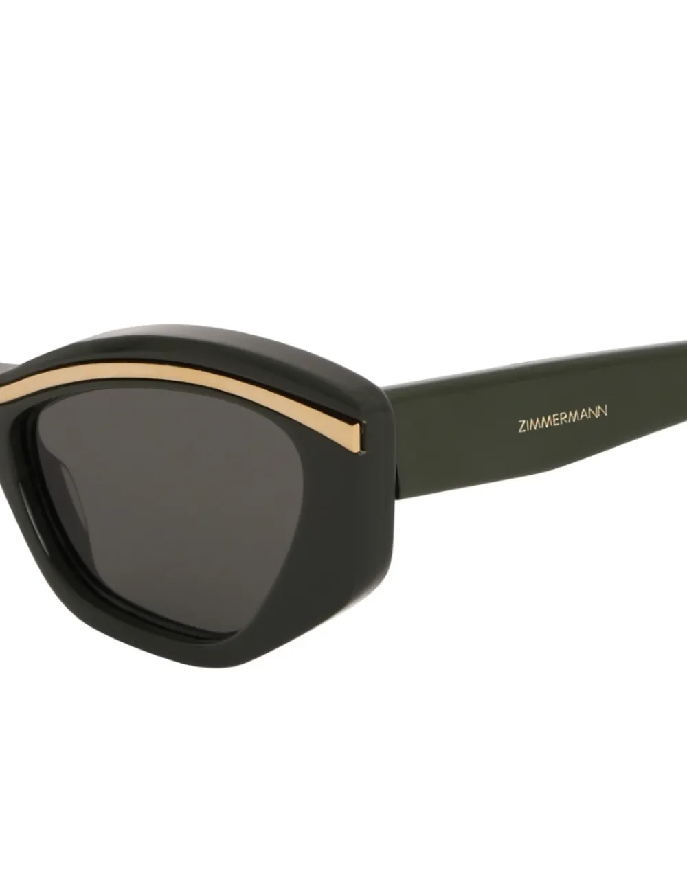 The Zimmermann Lyrical Cat Eye In Khaki From Our Fall 2023 Collection, Luminosity. An Acetate Cat-Eye Featuring A Contrast Gold Brow Bar.