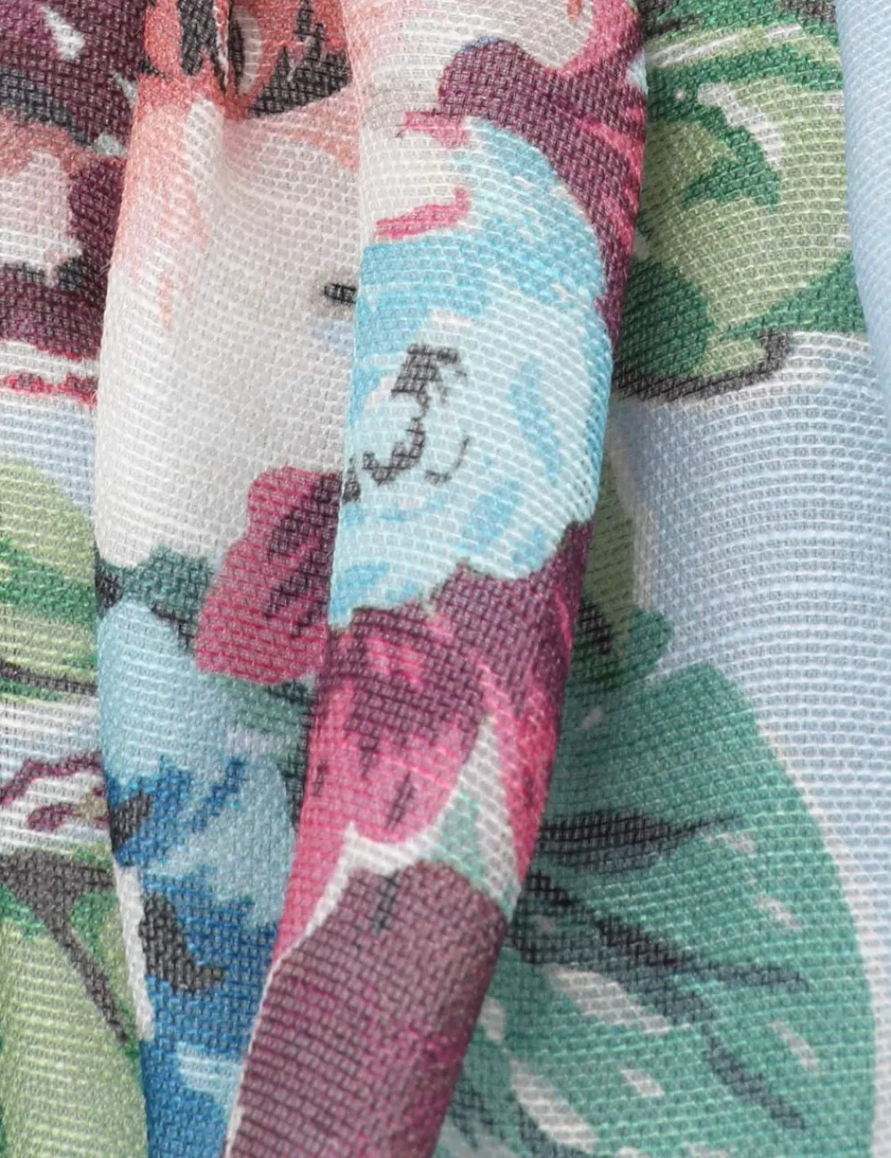 The Matchmaker Drape Midi Dress In Blue Barkcloth Print From Our Resort 2024 Collection, Matchmaker. A Silk Linen Organza Midi Dress Featuring A Structured Bodice And A Draped Skirt.