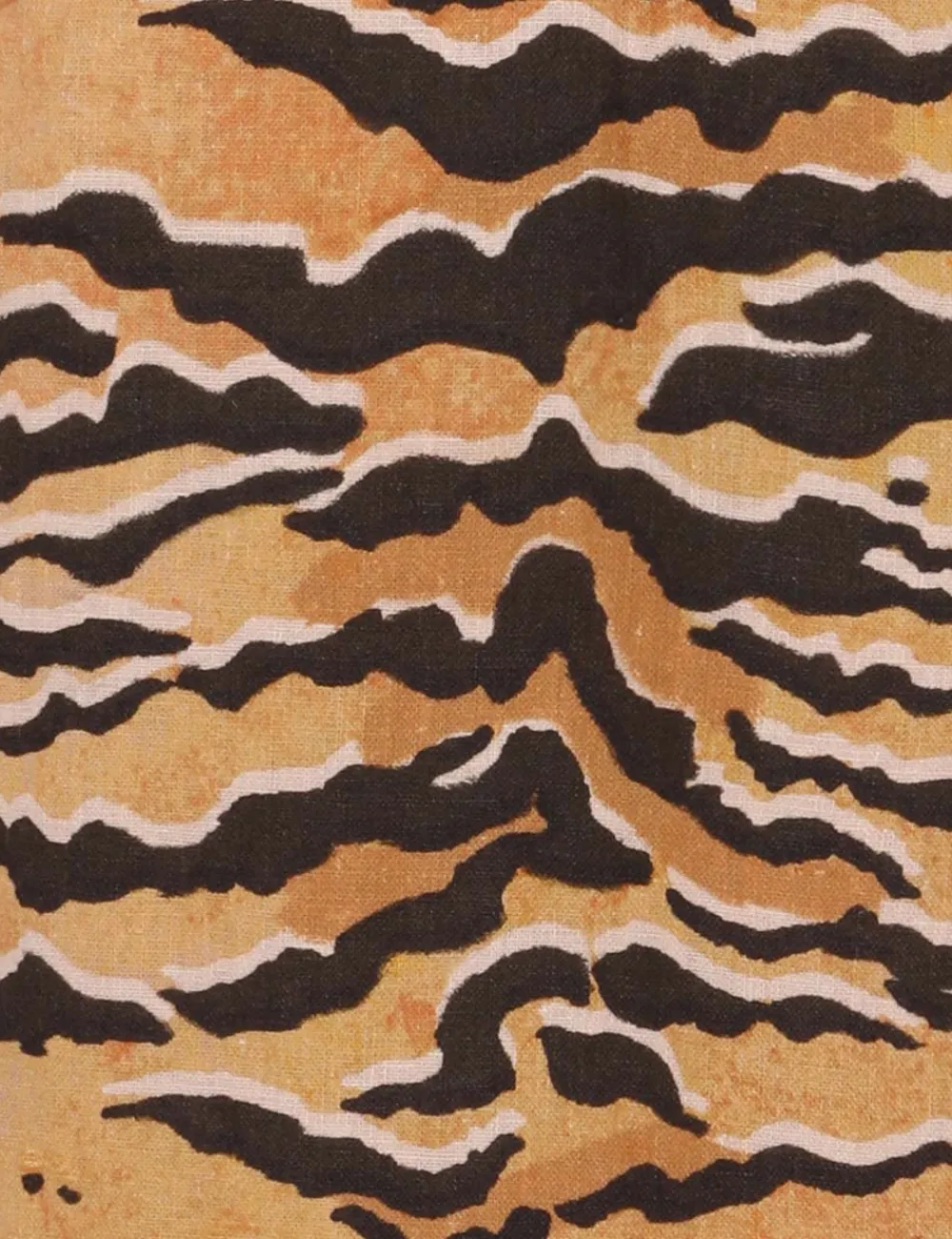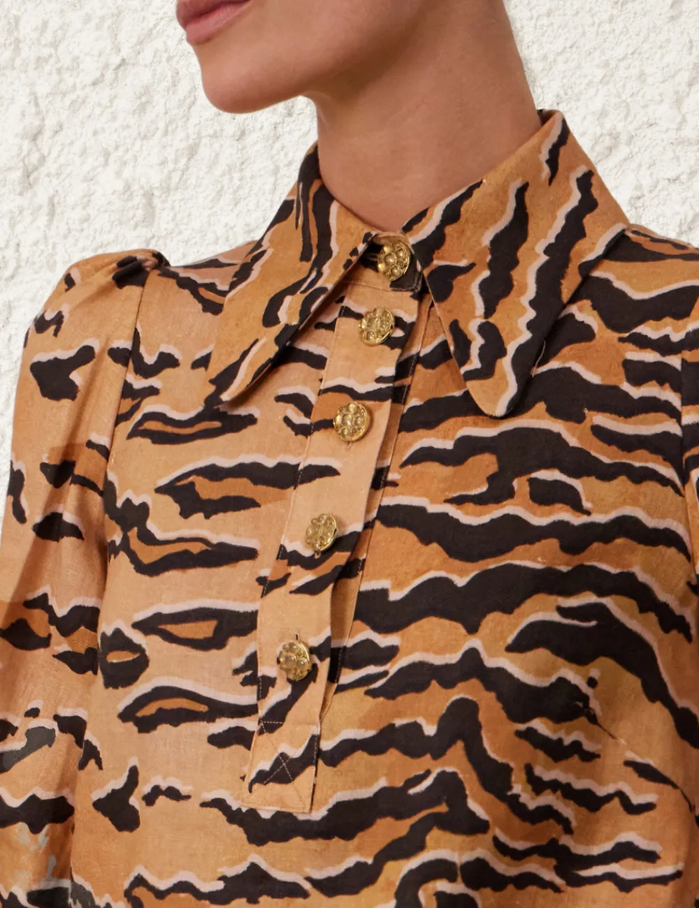 The Matchmaker Tunic Dress In Tan Tiger From Our Resort 2024 Collection, Matchmaker. A Linen Mini Dress Featuring A Classic Collar And Blouson Sleeves.