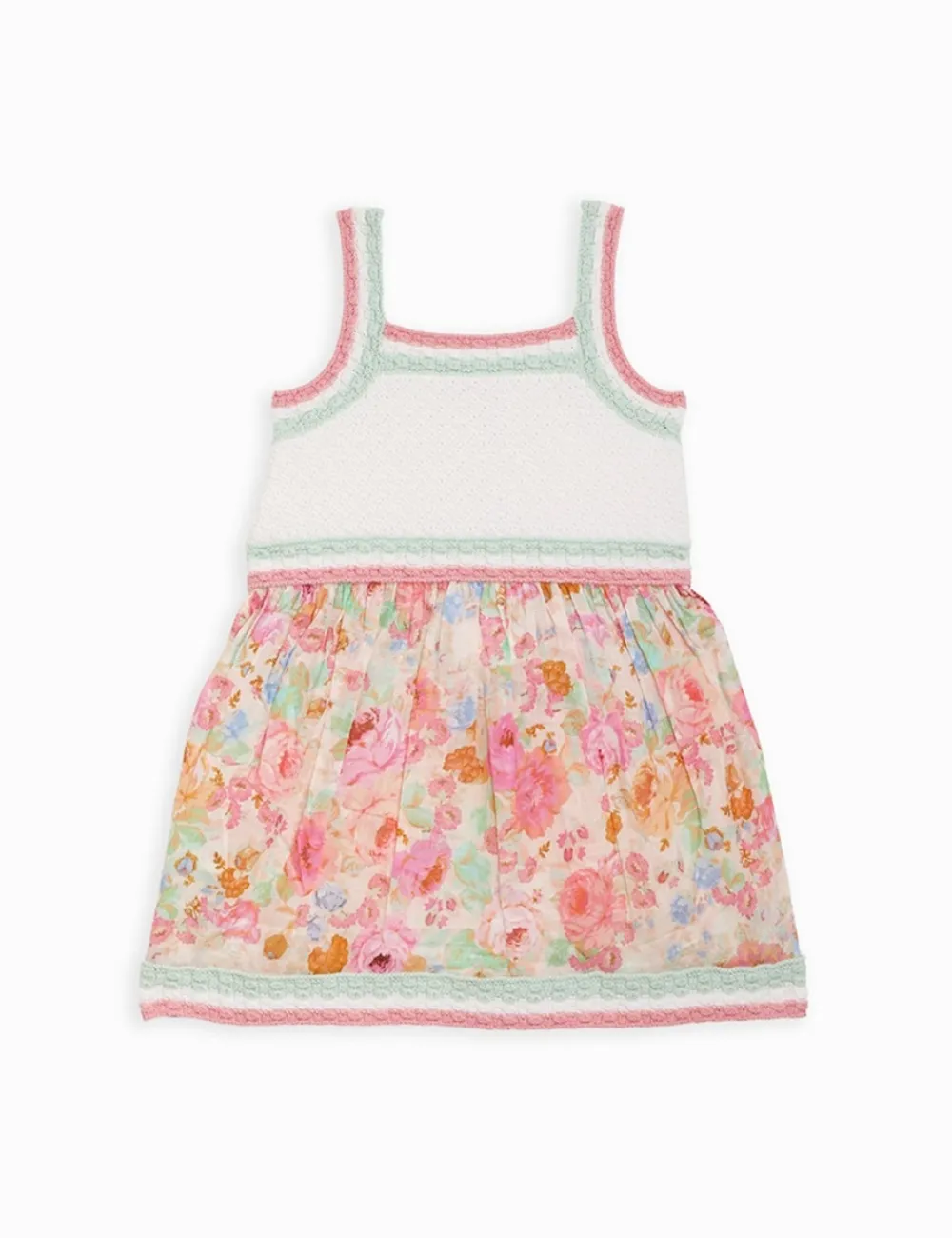 The Raie Knit Top Woven Dress In Pink Multi Floralfrom Our Summer Swim 2023 Collection. A Mini Dress Featuring A Knitted Bodice With Contrast Edges, Finished With A Placement Print Through The Skirt.