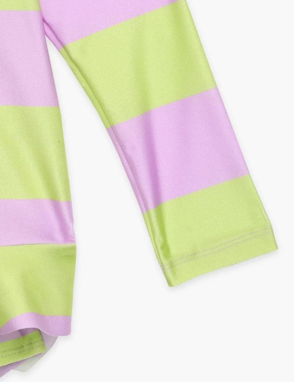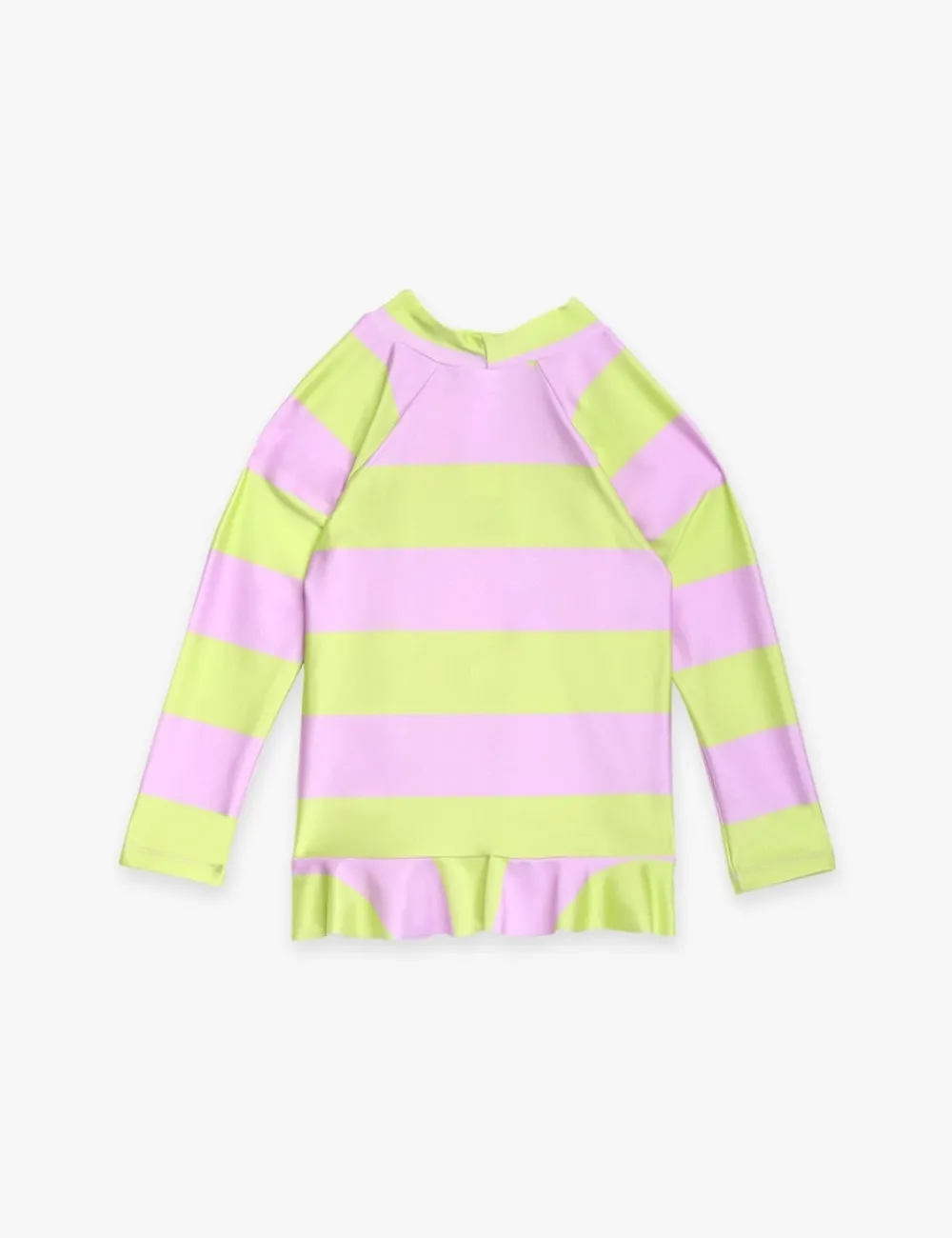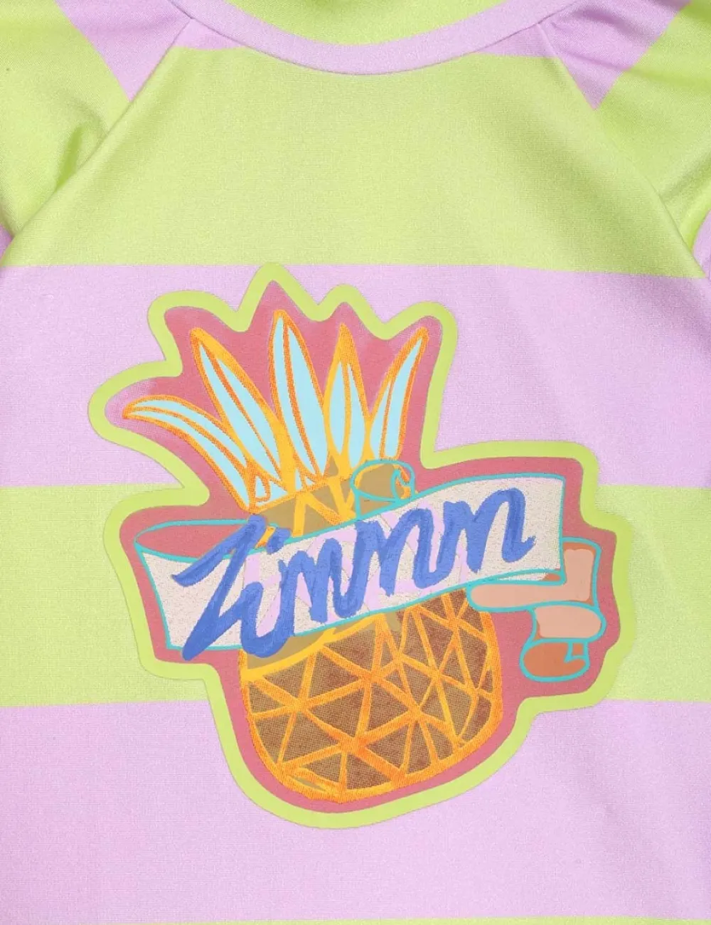 The Raie Pineapple Frill Rashie In Green/Lilac From Our Summer Swim 2023 Collection. A Kids Rashie Featuring A Custom Designed Pineapple Patch At Centre Front.