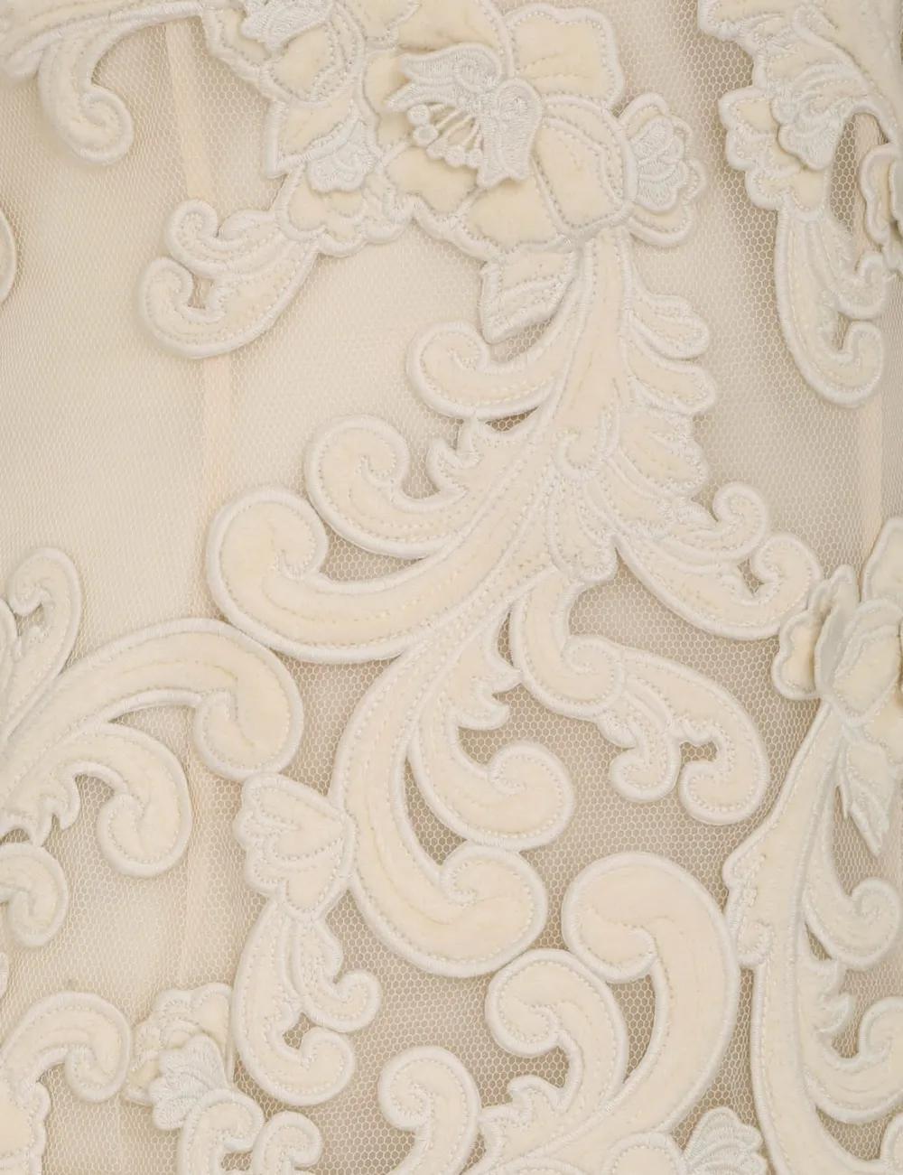 The Sensory Motif Gown In Macadamia From Our Fall 2023 Collection, Luminosity. A Midi Dress Featuring Motifs Of Velvet Embroidery Throughout.