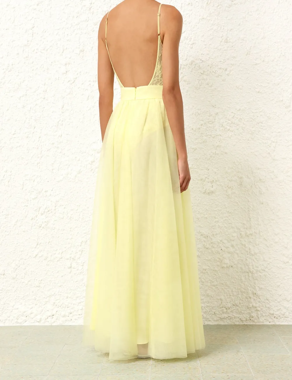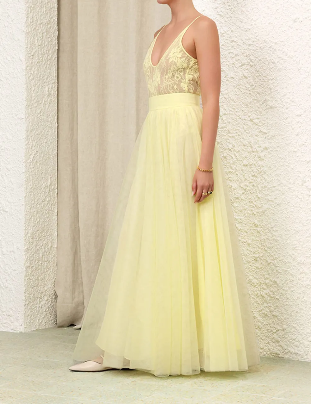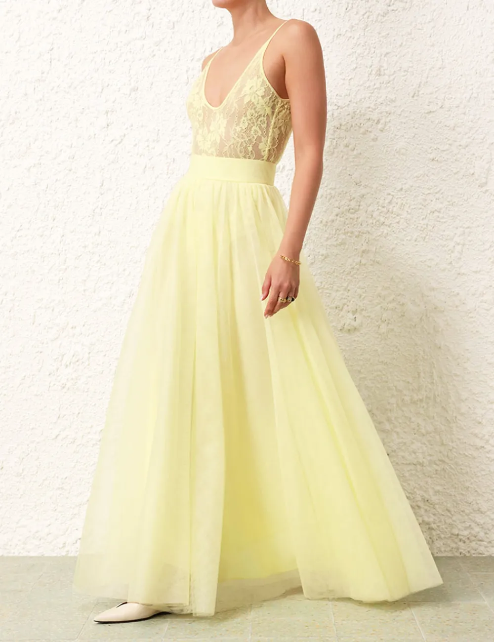 The Tulle Skirt In Lemon From Our Resort 2024 Collection, Matchmaker. A Midi Skirt Featuring A High Waist And Raw Hem.