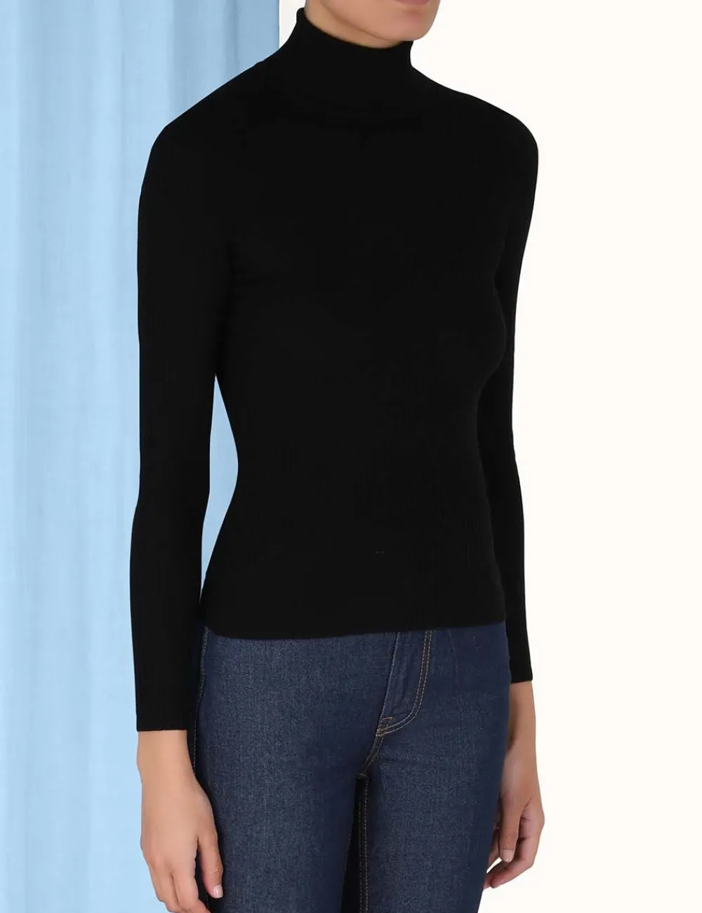 The Turtleneck Rib Top In Black From Our Fall 2023 Collection, Luminosity. A Long Sleeve Woollen Top Featuring A High Turtle Neck.