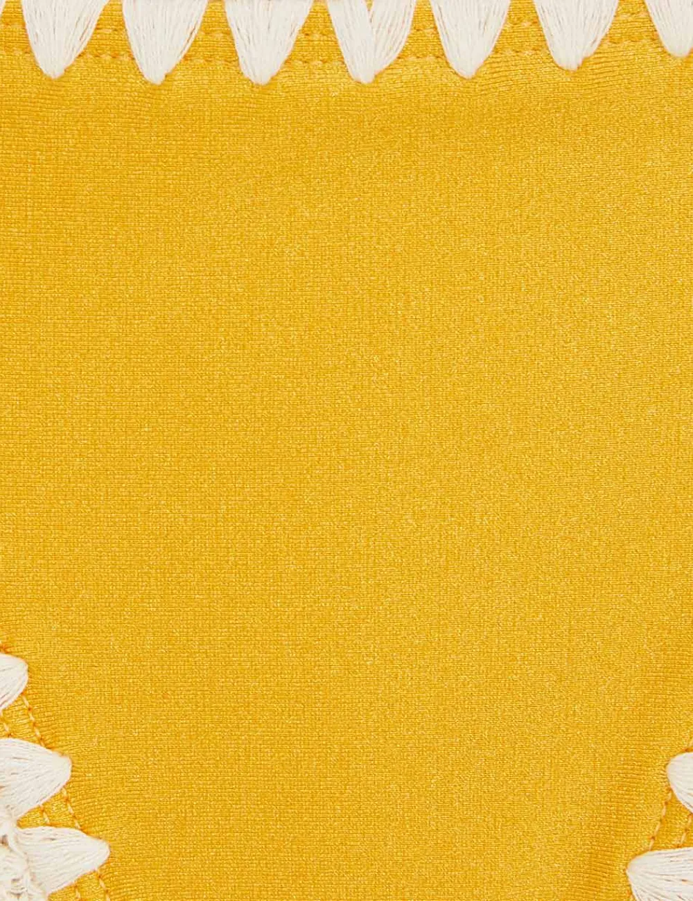 The Vacay Crochet Edge Bikini In Golden Yellow From Our Summer Swim 2023 Collection. An Italian Lycra Bikini Set Featuring Crochet Edging And Self Tie Straps With Toggle Ends.
