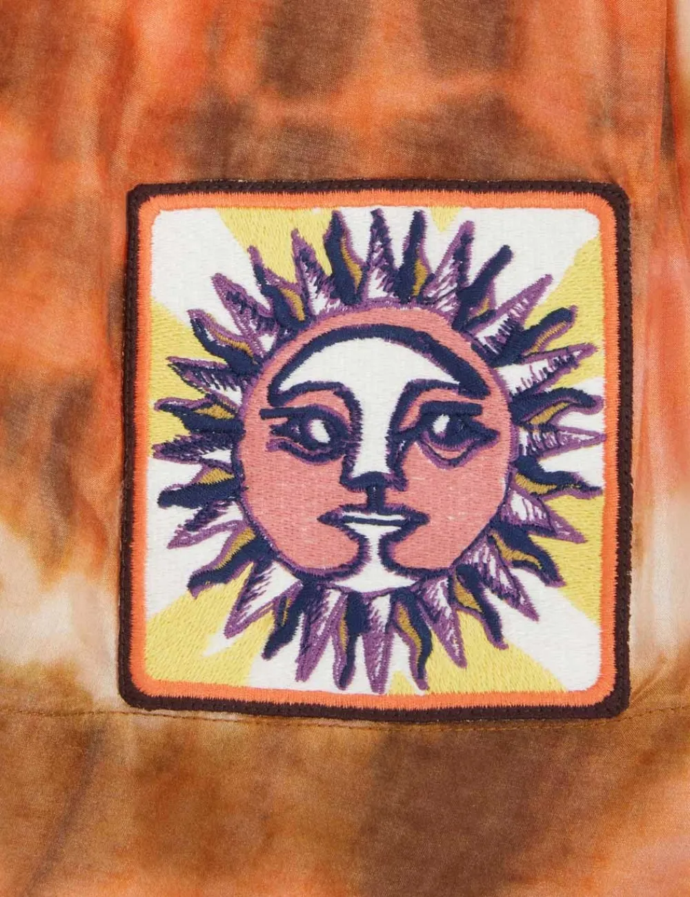 The Vacay Relaxed Short In Red/Brown Tie Dye From Our Summer Swim 2023 Collection. A Silk Printed Short Featuring Pockets, An Elasticated Waistband And A Self Tie Waist.