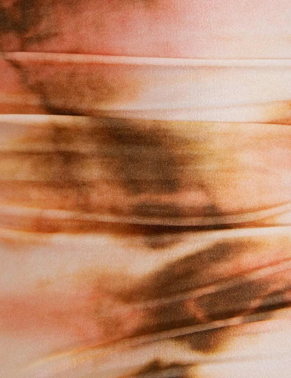 The Vacay Ruched Side 1Pc In Red/Brown Tie Dye From Our Summer Swim 2023 Collection. An Italian Lycra One Piece Featuring Ruched Sides, A Shelf Bra, Gripper Elastic Along The Chest And Detachable Straps.
