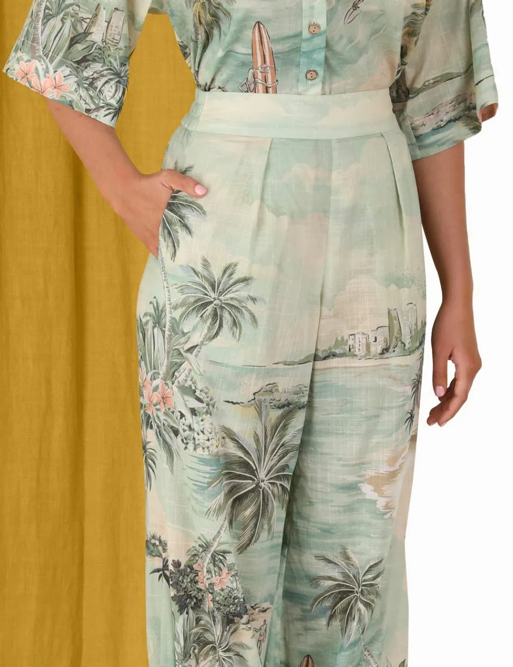 The Vacay Tied Track Pant In Green Multi From Our Summer Swim 2023 Collection. A Cotton Pant Featuring Elastic Along The Waistband, Side Seam Pockets And Ties At The Hem.