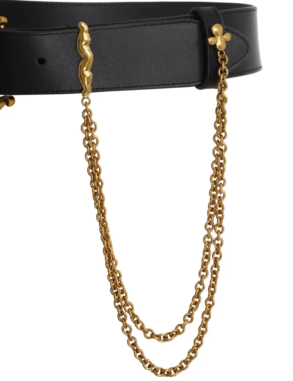 The Western Waist Belt In Black From Our Fall 2023 Collection, Luminosity. A Leather Waist Belt Featuring A Western Look Buckle And A Draped Chain.
