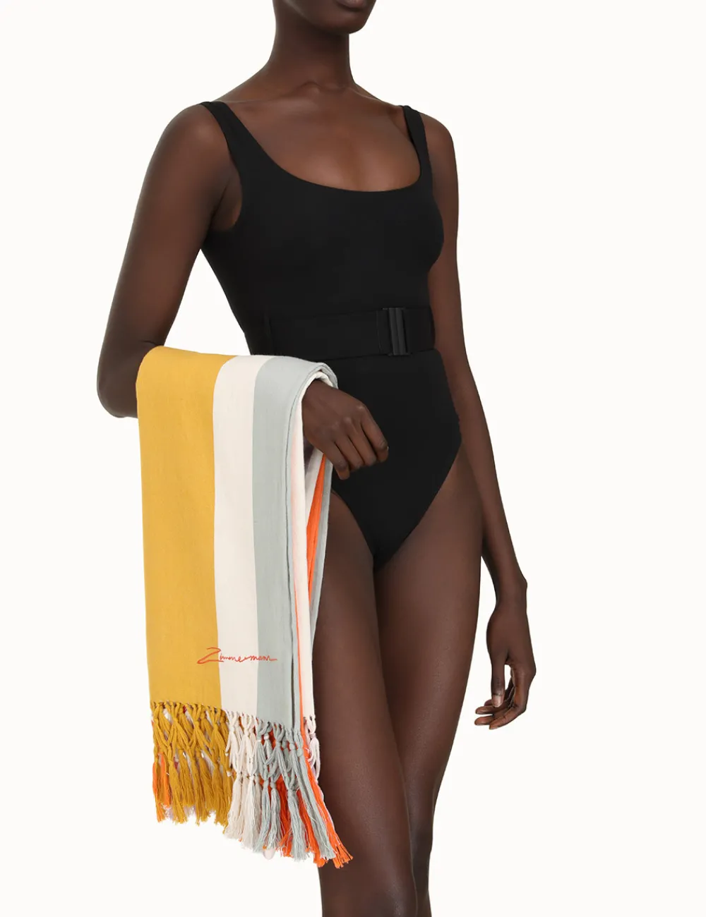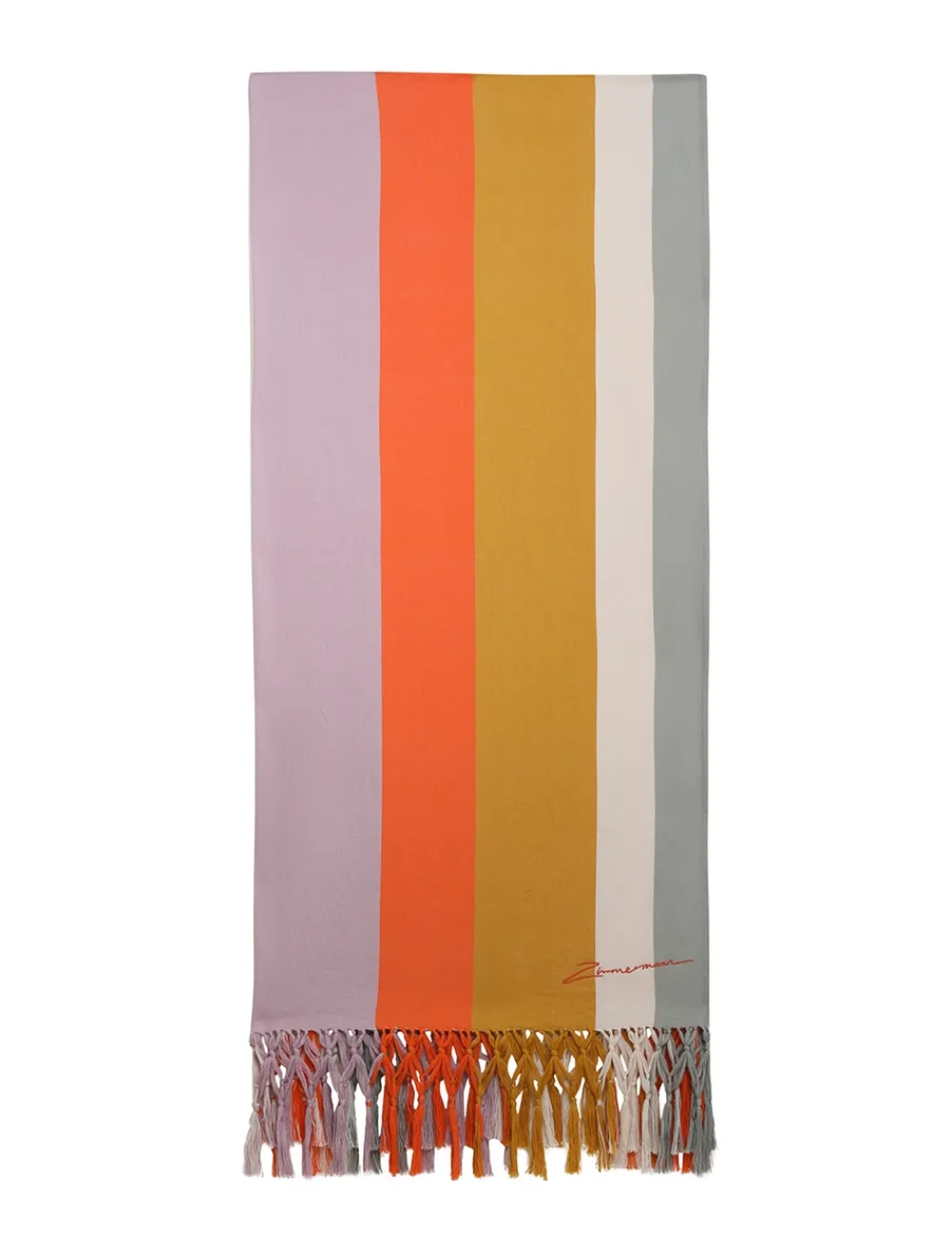 The Woven Jacquard Towel In Multi From Our Summer Swim 2023 Collection. A Large Jacquard Beach Towel Featuring Contrast Stripes And Tasselled Edges.